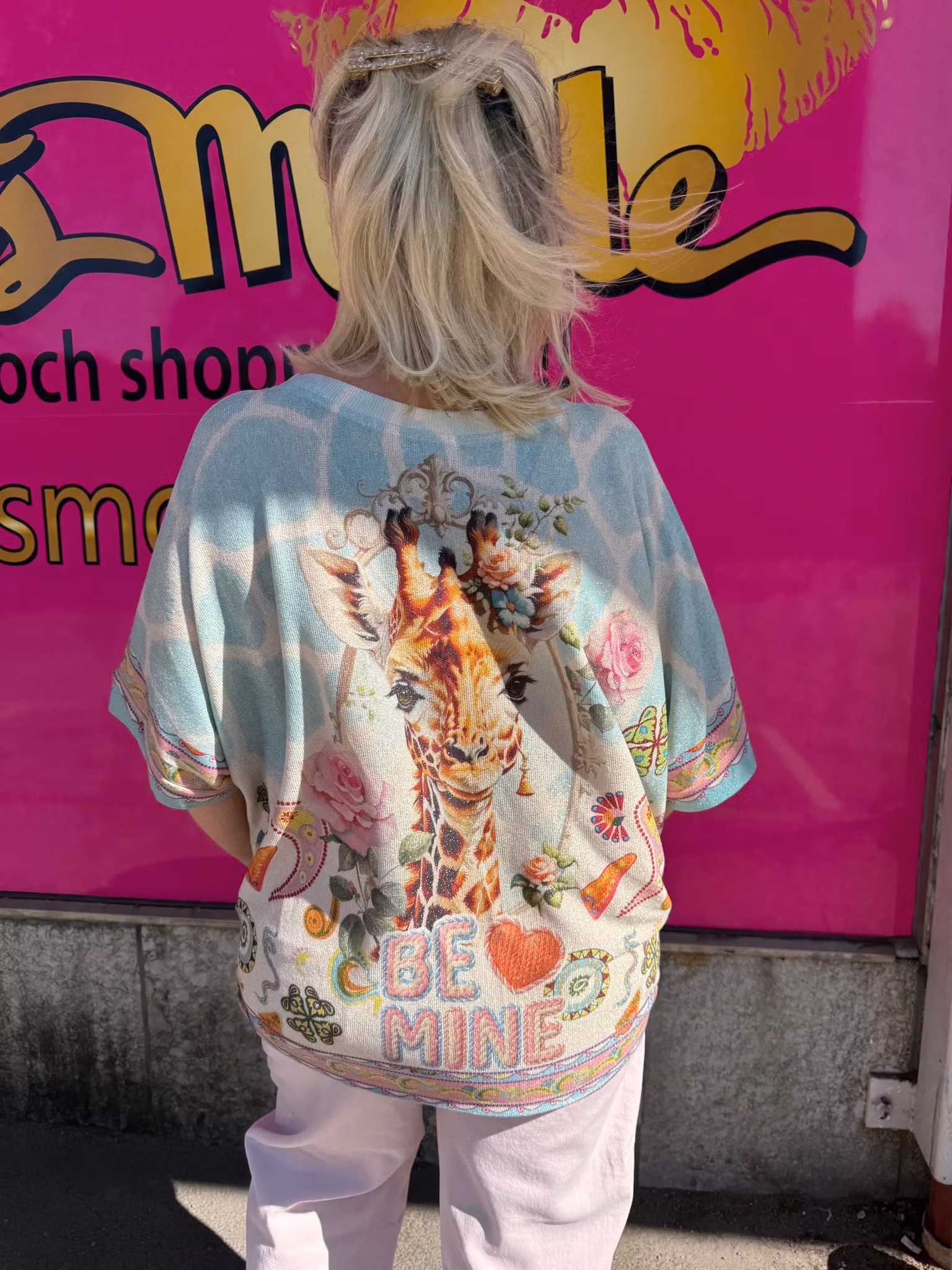 En lekfull och stilfull topp som verkligen drar blickarna till sig. Framsidan pryds av ett detaljerat giraffmotiv med dekorativa inslag av blommor och subtila guldfärgade detaljer som ger ett exklusivt intryck. Den mjuka färgpaletten i pastelltoner kombineras med ett grafiskt mönster för en modern och personlig stil.
