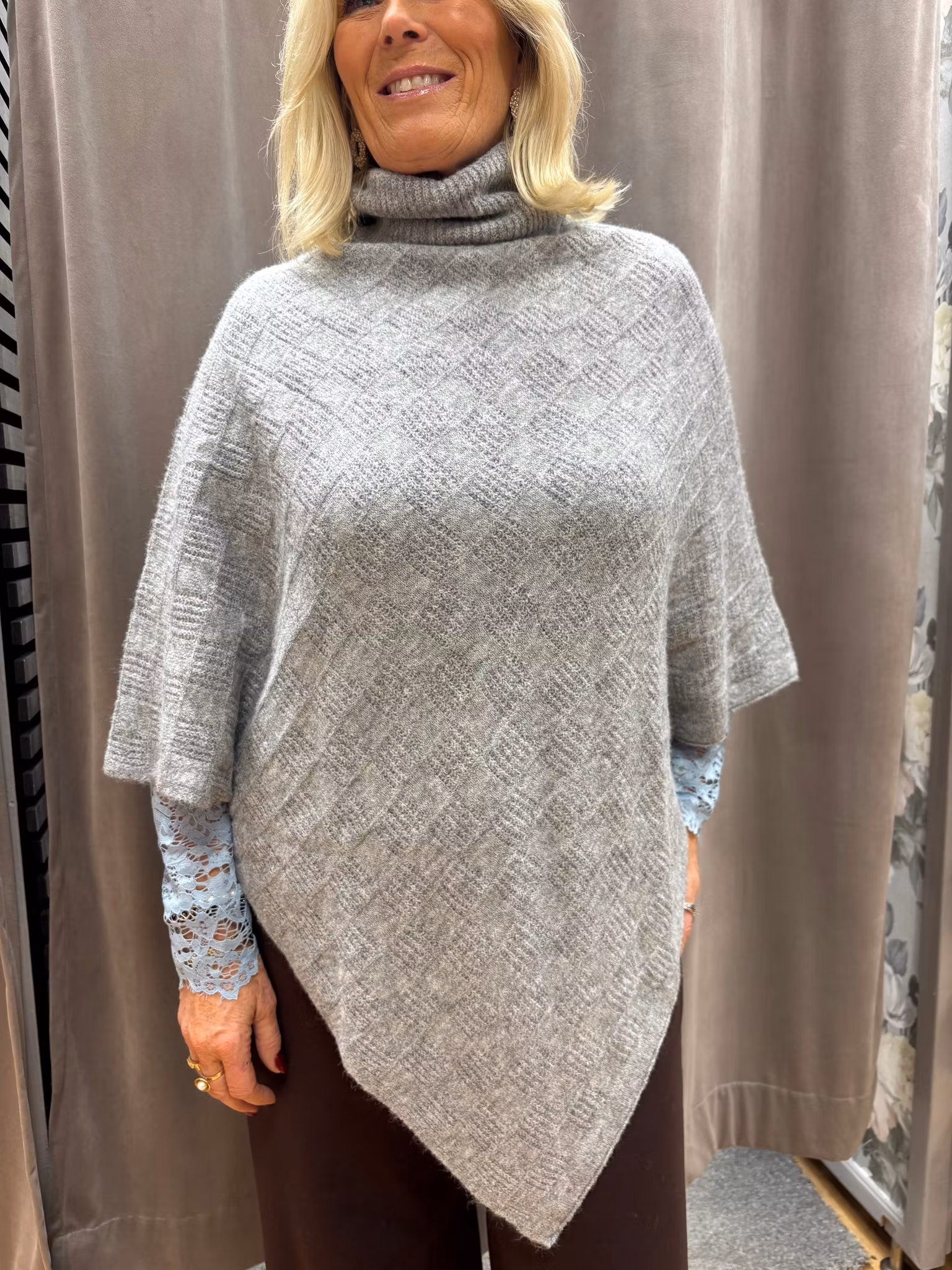 Mjuk och stilren poncho med polokrage och korta ärmar. Den har en lätt asymmetrisk form som skapar ett elegant fall och ger plagget ett modernt uttryck. Den subtila strukturen i materialet ger liv och djup utan att ta över, och passformen gör ponchon enkel att bära över både blusar och tröjor. Ett varmt och mångsidigt plagg som passar lika bra till vardag som till mer dressade kombinationer.