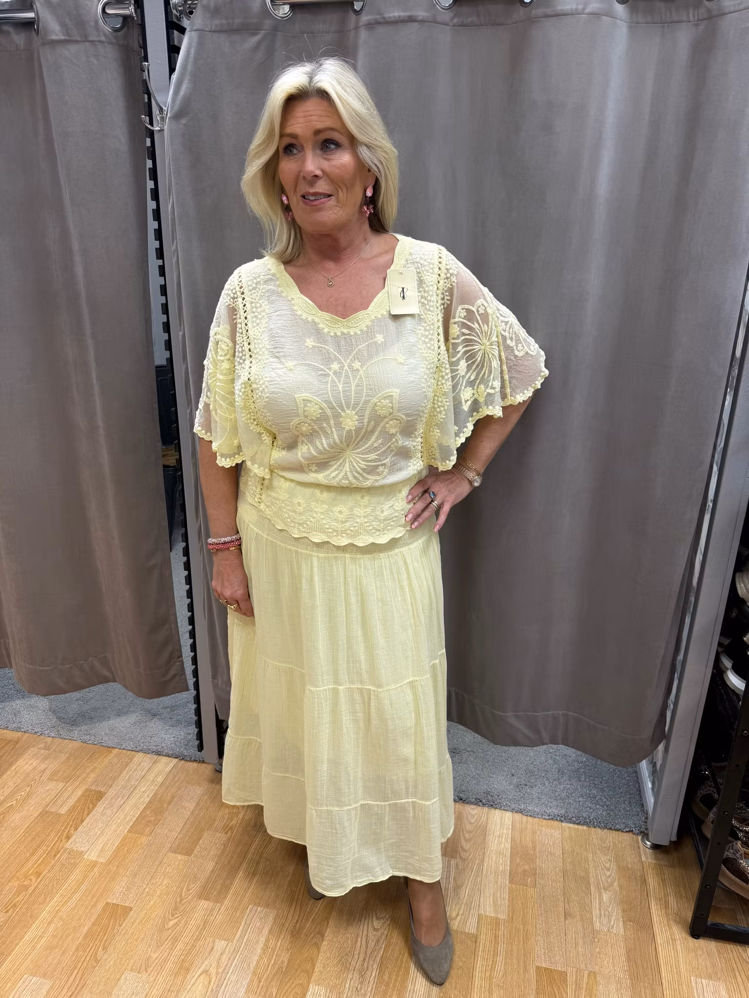 Supersöt topp i spets med resår vid midjan eller lite längre ner som ger smickrande feminin passform. ej genomskinlig på kroppen fram och bak.