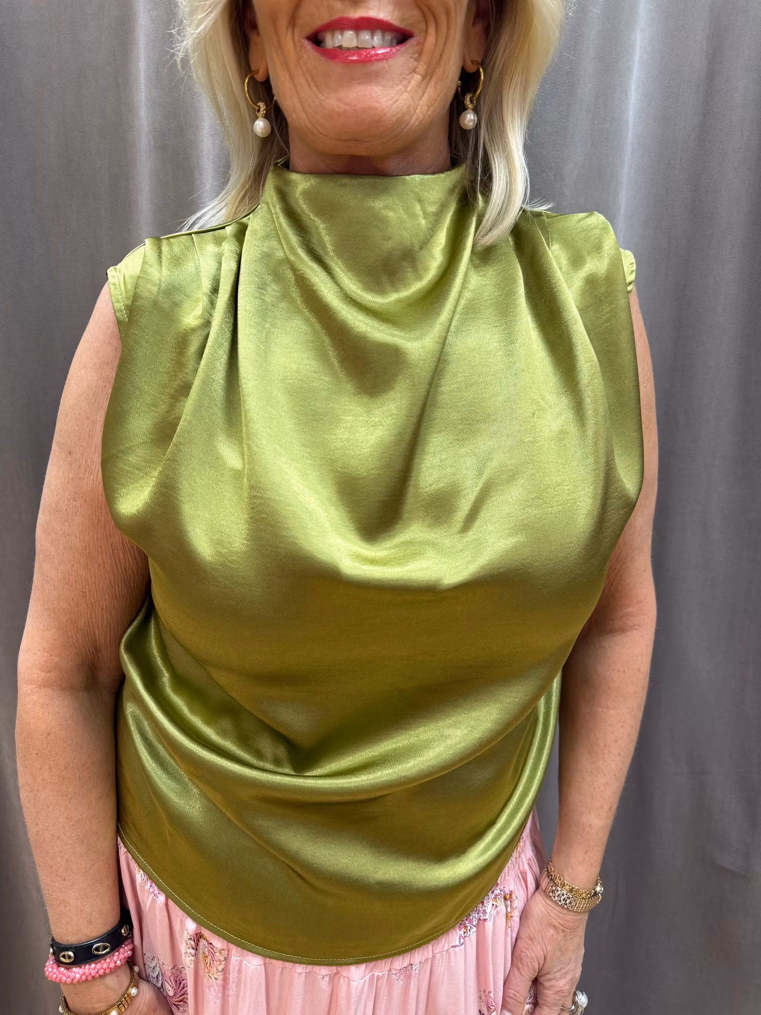 En elegant och sofistikerad topp i glansig satin med ett vackert fall. Den höga, mjukt draperade halsringningen skapar en lyxig siluett och ger ett stilrent uttryck som passar både till vardag och fest.
