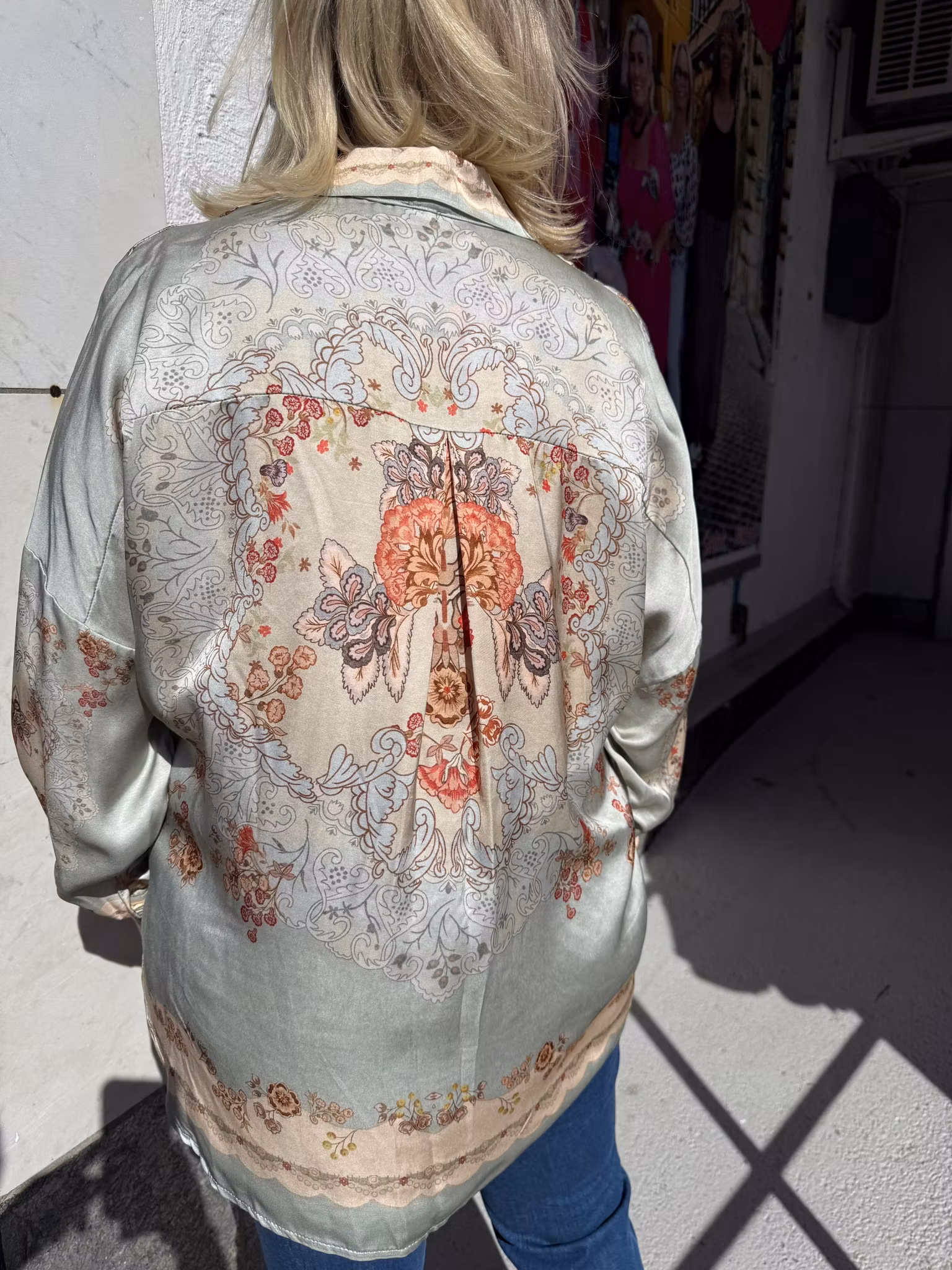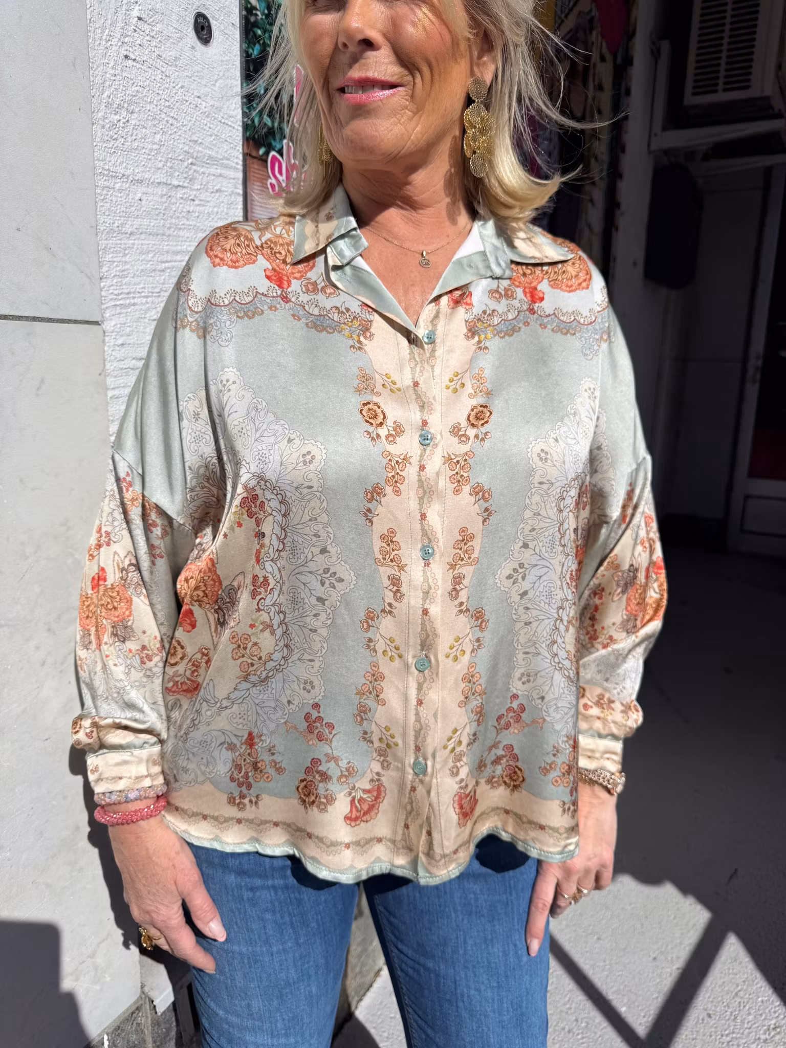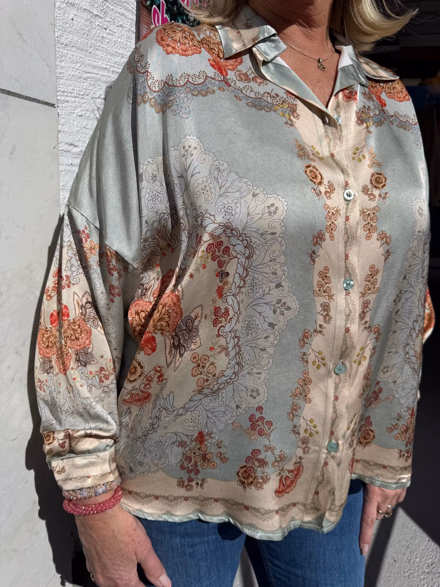 En stilfull skjortblus med ett rikt, dekorativt mönster som ger ett sofistikerat och feminint uttryck. De harmoniska tonerna och de detaljerade ornamenten skapar en exklusiv känsla som passar både till vardag och fest.