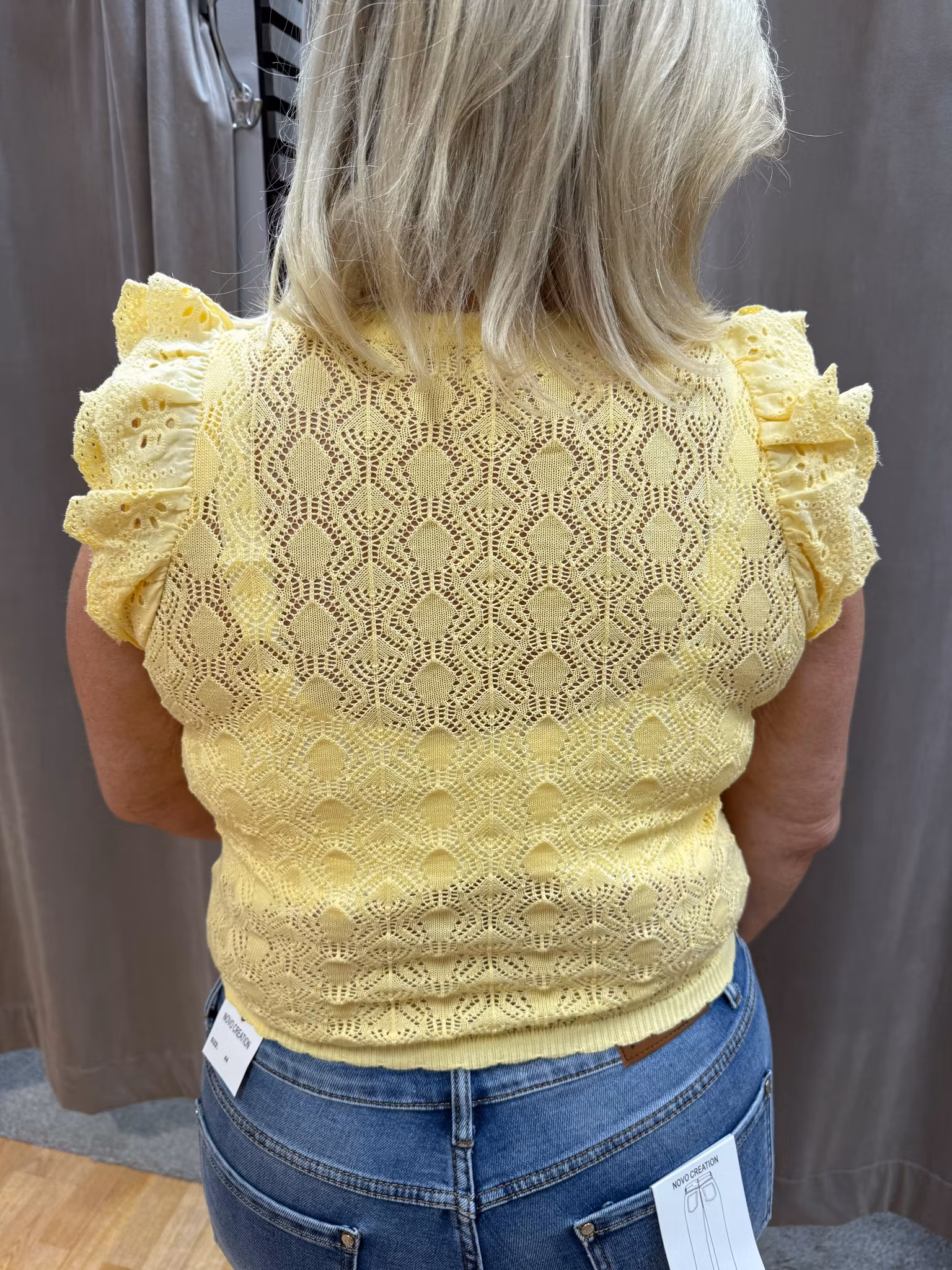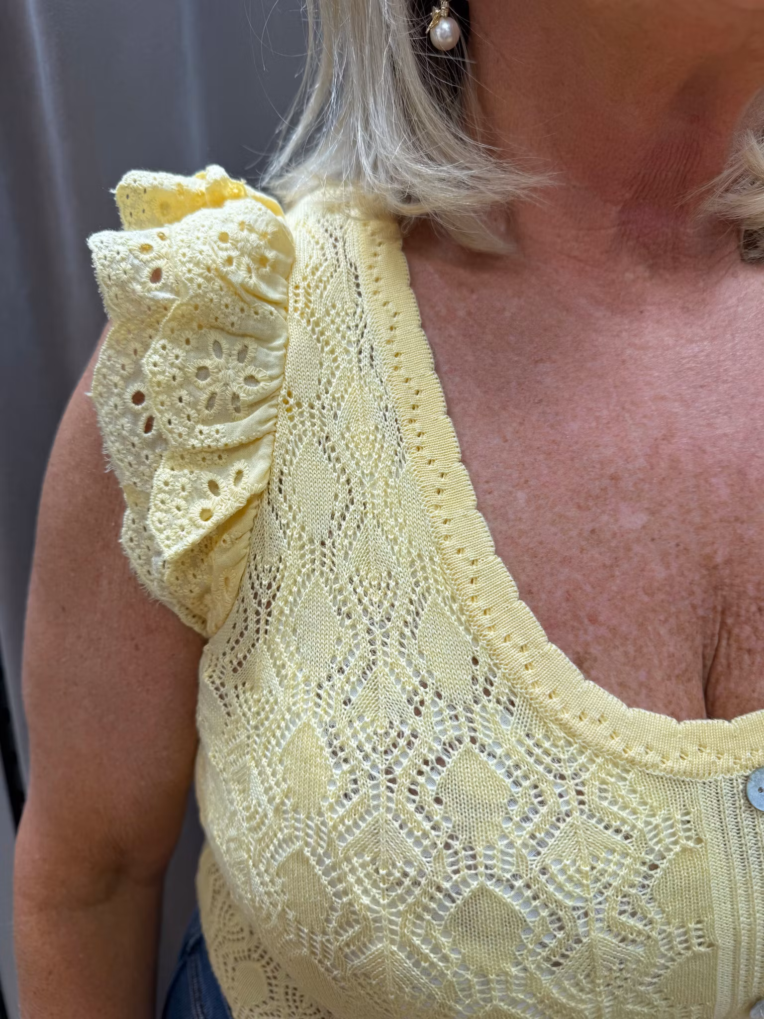 En feminin och elegant topp med vacker spetsstickning som ger ett sofistikerat och romantiskt uttryck. Den luftiga, mönsterstickade kvaliteten skapar en exklusiv känsla samtidigt som materialet är mjukt och behagligt mot huden.