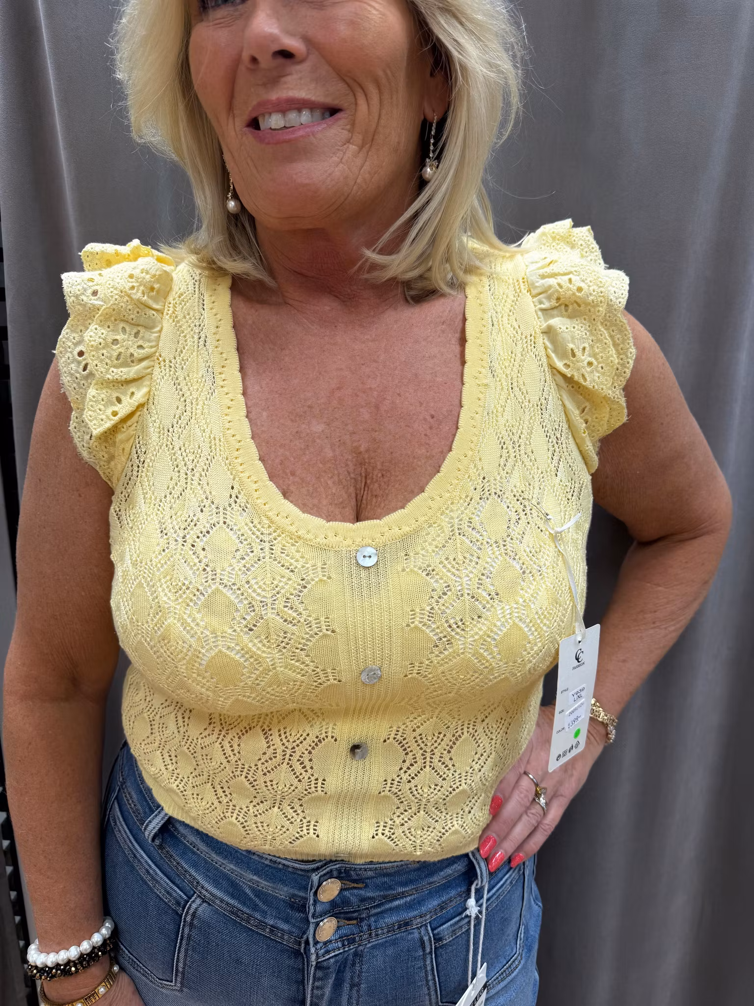 Toppen har en rundad urringning med dekorativa knappar framtill samt fina volangdetaljer över axlarna som ger ett smickrande och stilfullt fall. Den lätt kroppsnära passformen gör den enkel att bära både instoppad och utanpå byxor eller kjol.