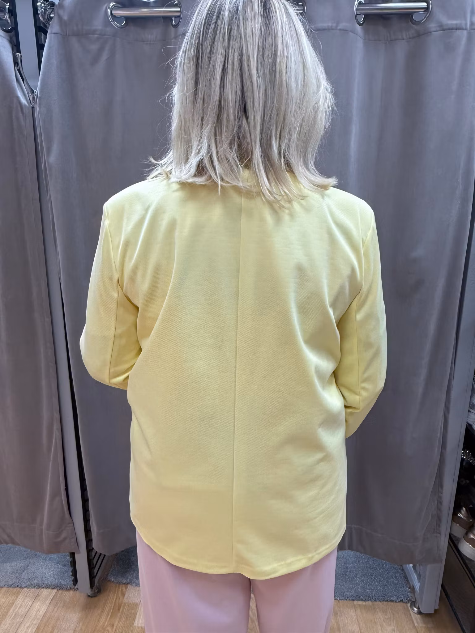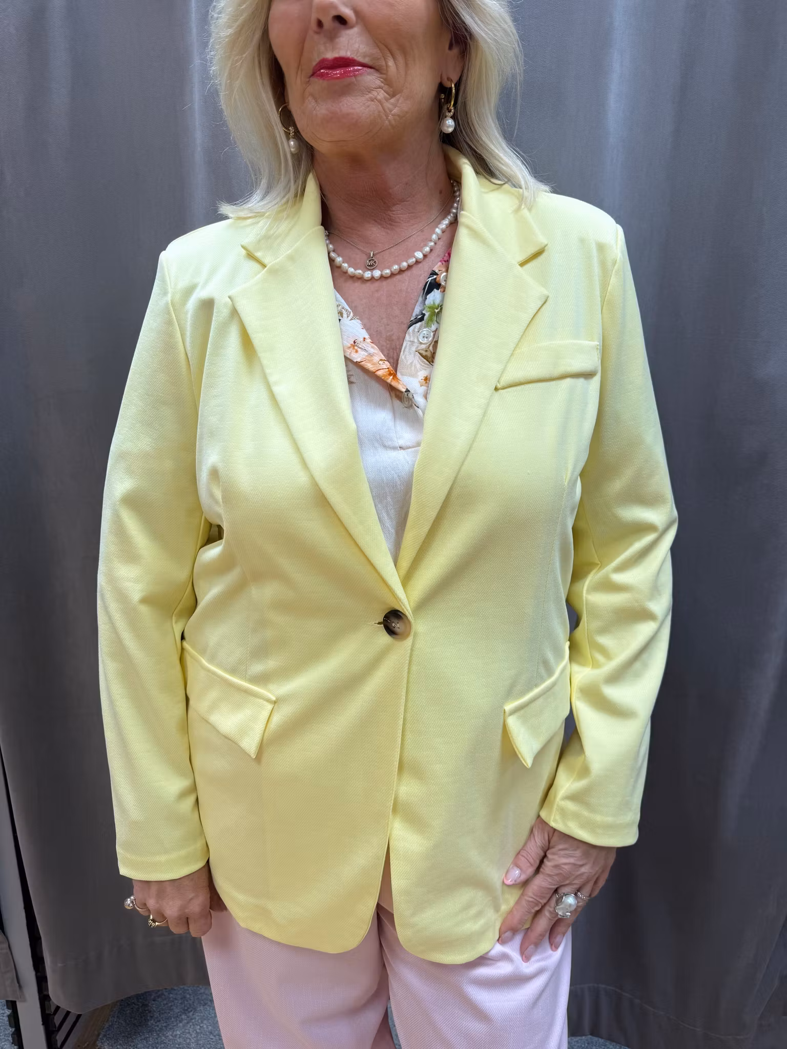 Kavajen har en rak passform med dekorativa fickor framtill och en knapp som ger ett elegant avslut. Den fräscha färgen lyfter hela outfiten och gör den perfekt både till vardag och mer uppklädda tillfällen.