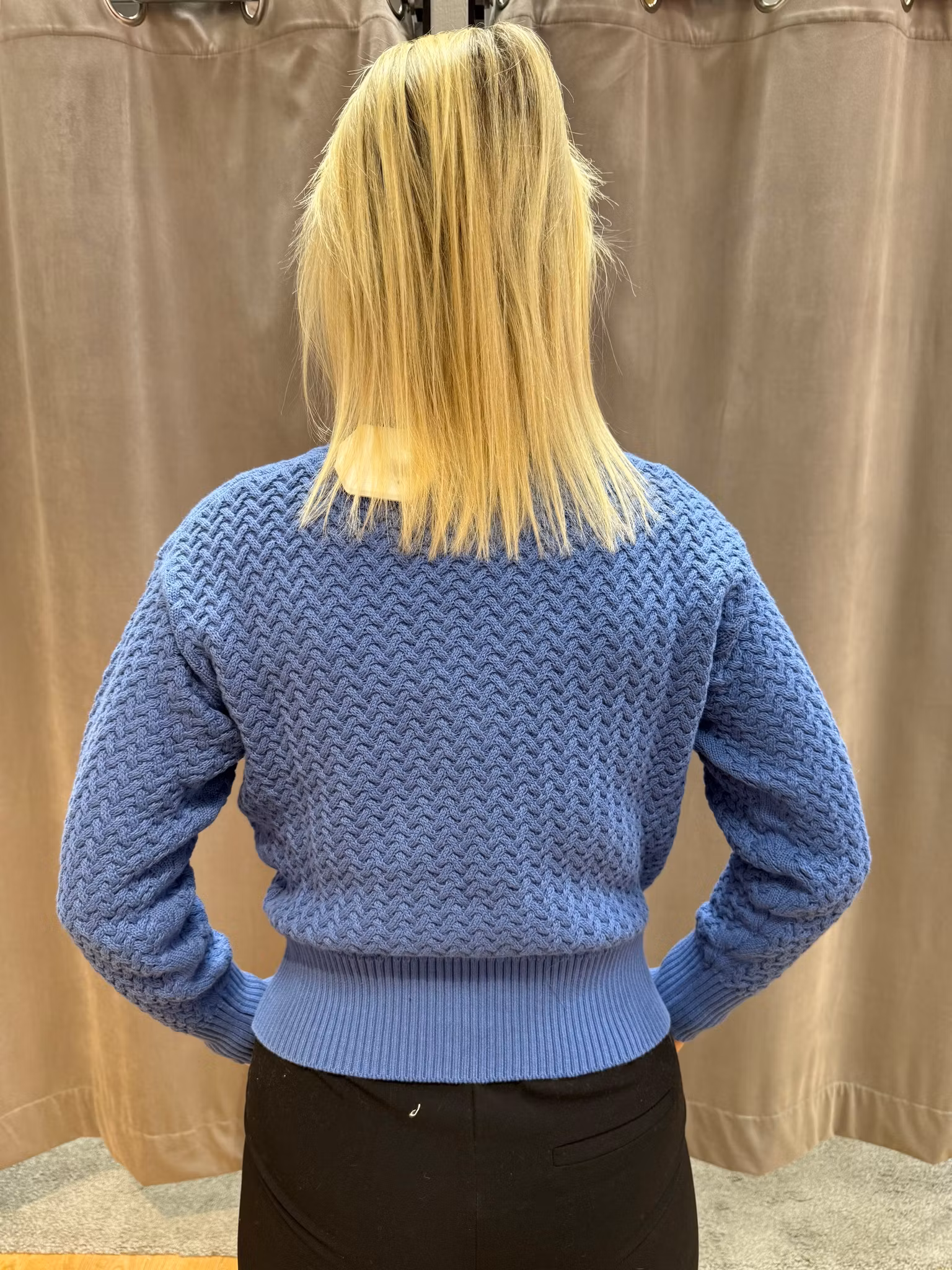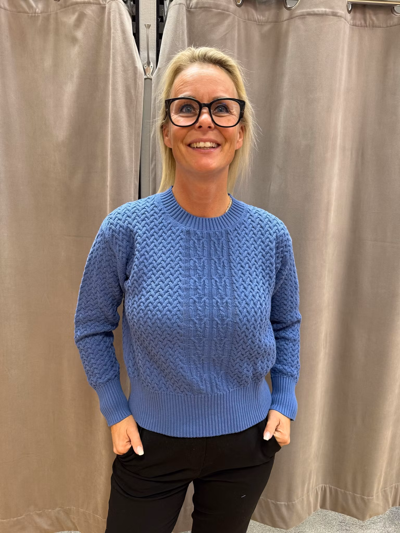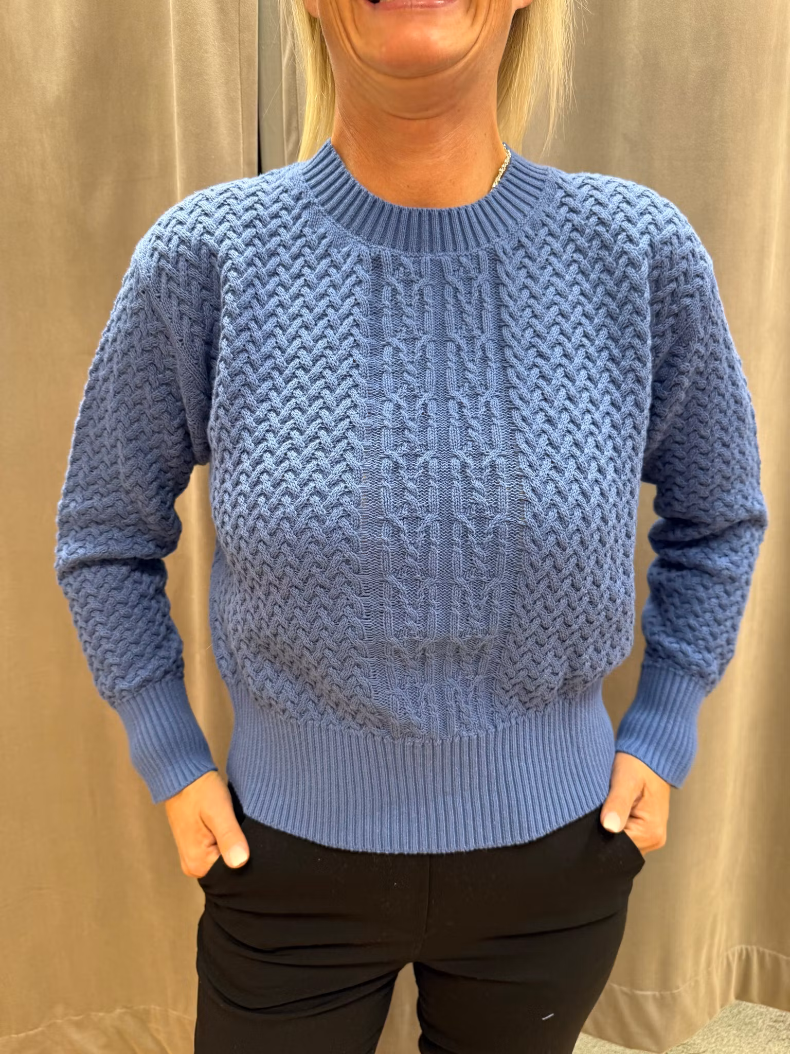 Stilren kabelstickad tröja i en vacker blå nyans. Tröjan har rund halsringning, ribbade muddar och ett klassiskt stickat mönster framtill. En tidlös favorit som är både bekväm och lätt att matcha – perfekt för vardag eller jobb.