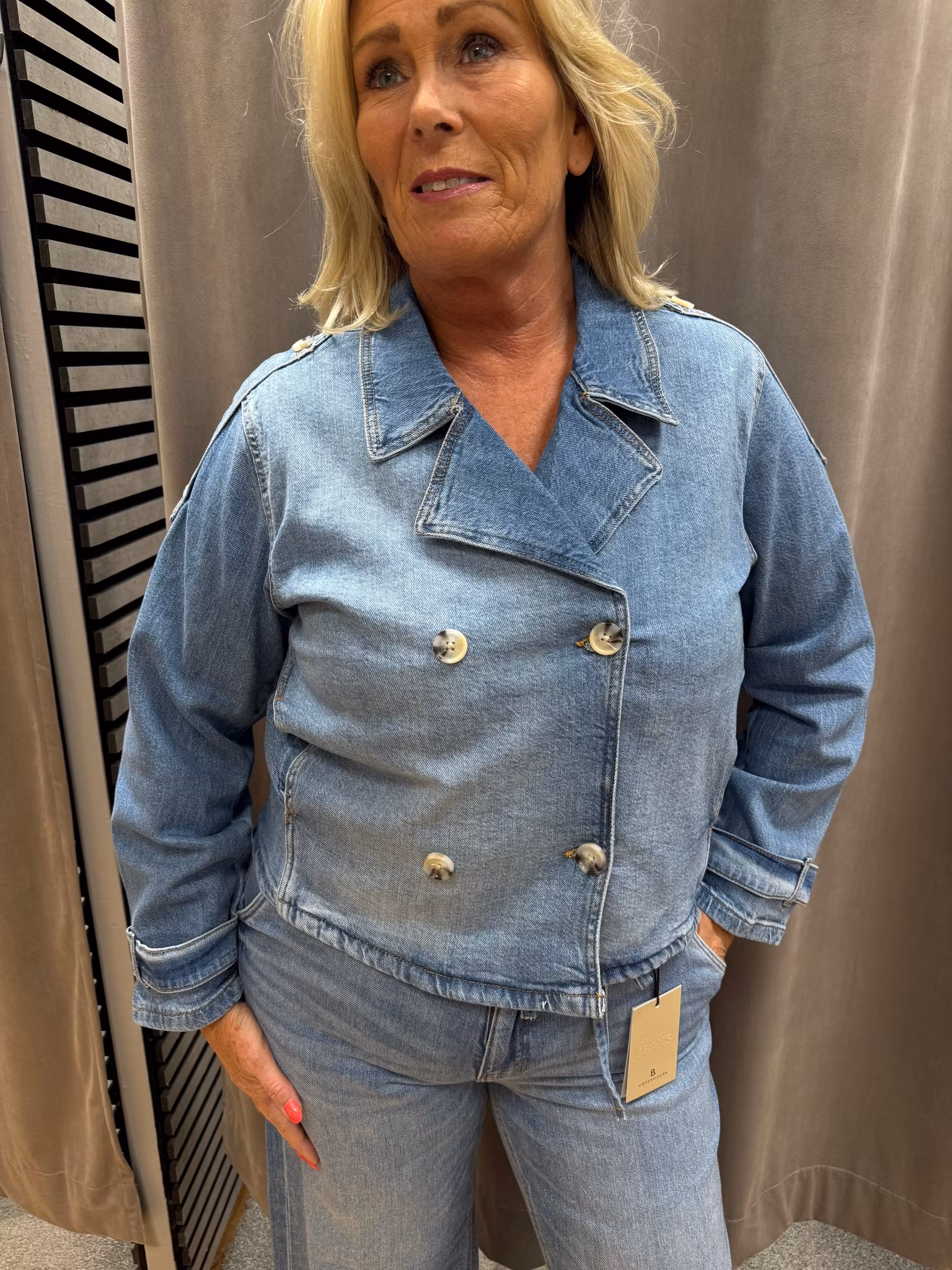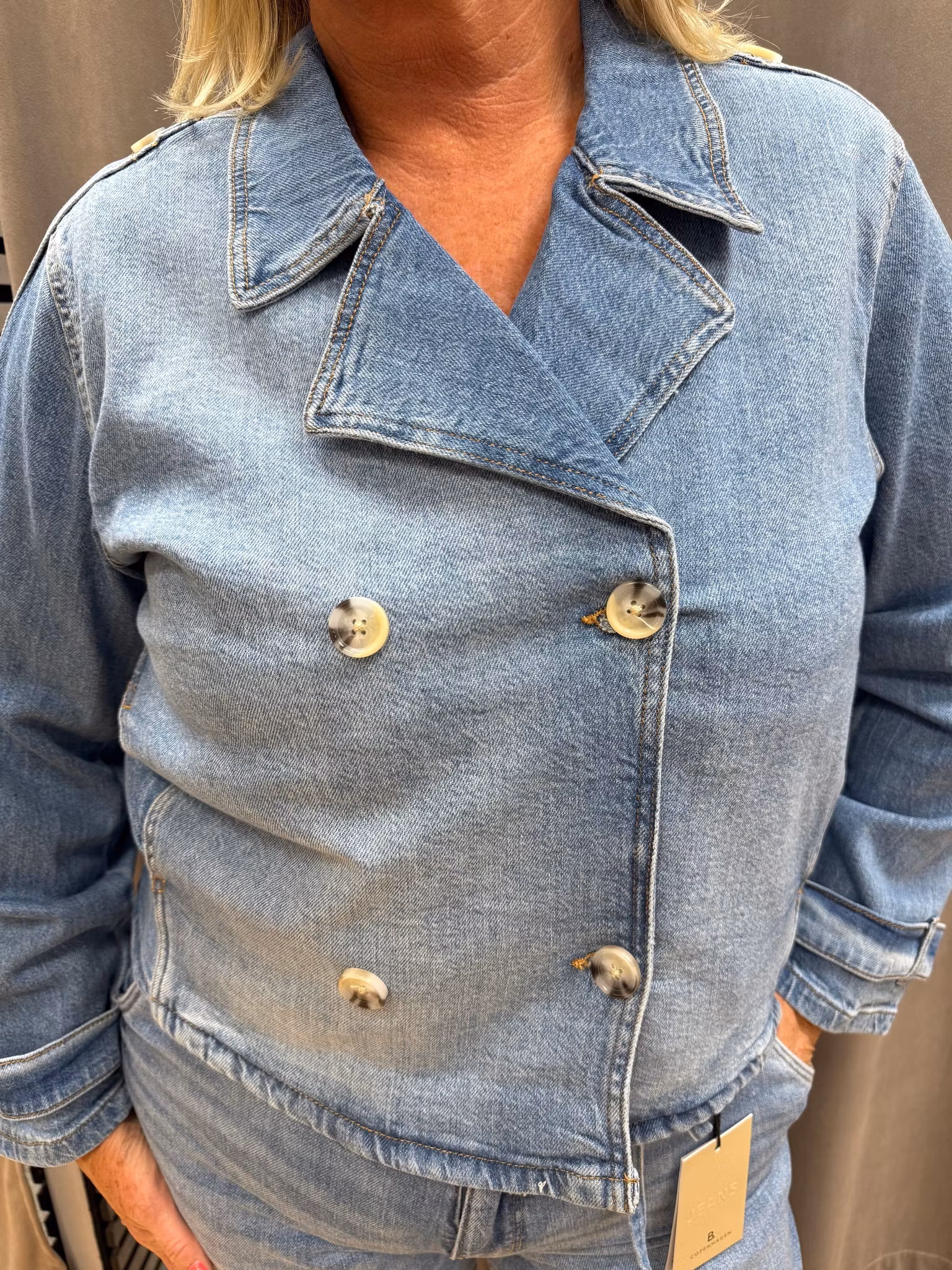 Stilren och trendig kort jeansjacka i ljusblå denim med trench-inspirerad design. Jackan har dubbelknäppning framtill, klassiska slag och dekorativa knappar som ger ett elegant och sofistikerat uttryck – inspirerat av den tidlösa trenchcoaten men i modern denimversion.