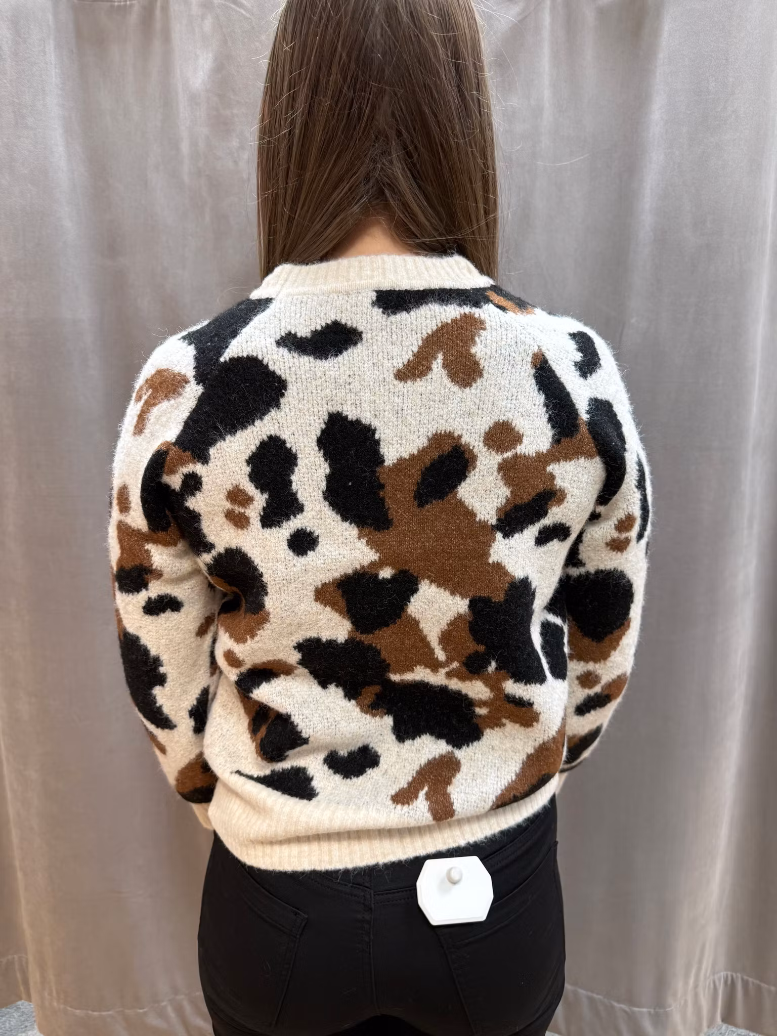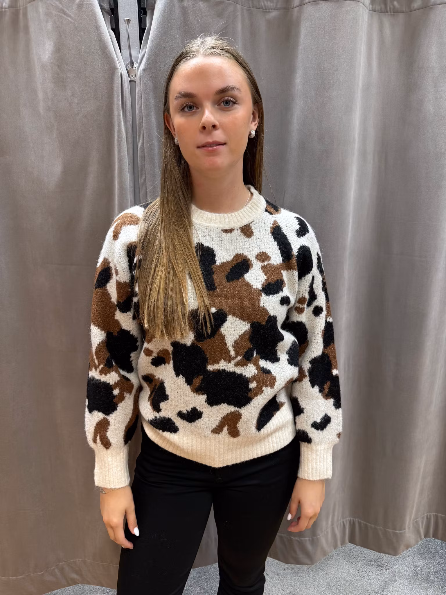 Beige tröja med svart och brunt ko-mönster. Stickad modell med rund halsringning, långa ärmar och mjukt material som gör den bekväm och modern. Perfekt vardagströja som sticker ut med sitt unika mönster.
