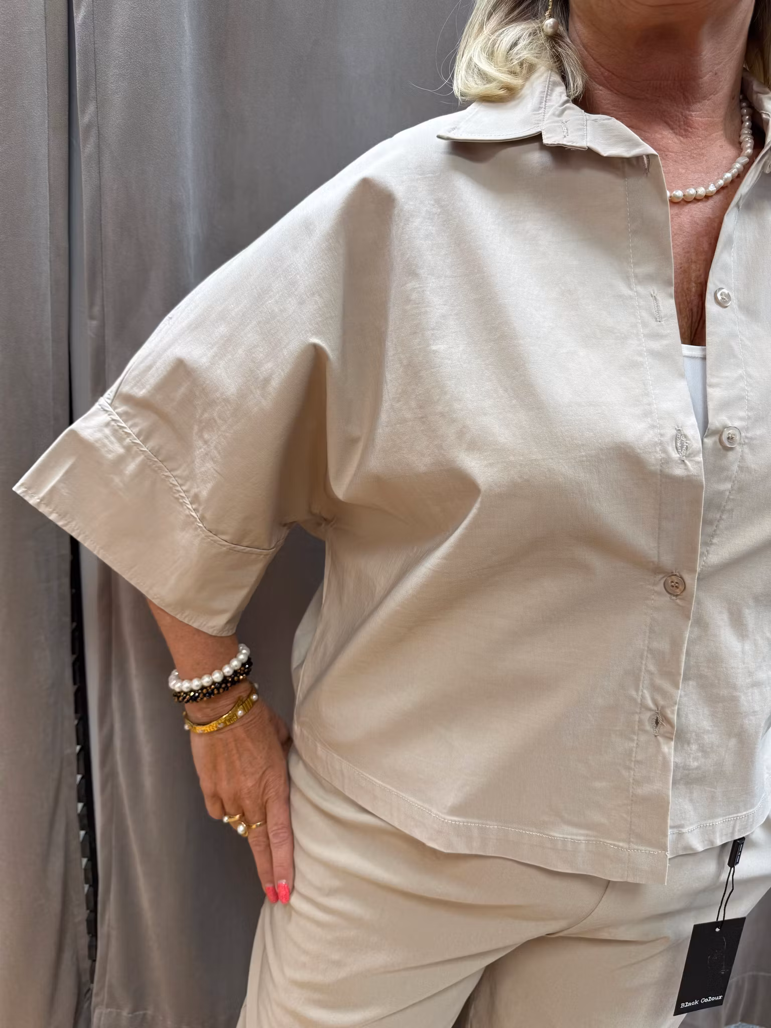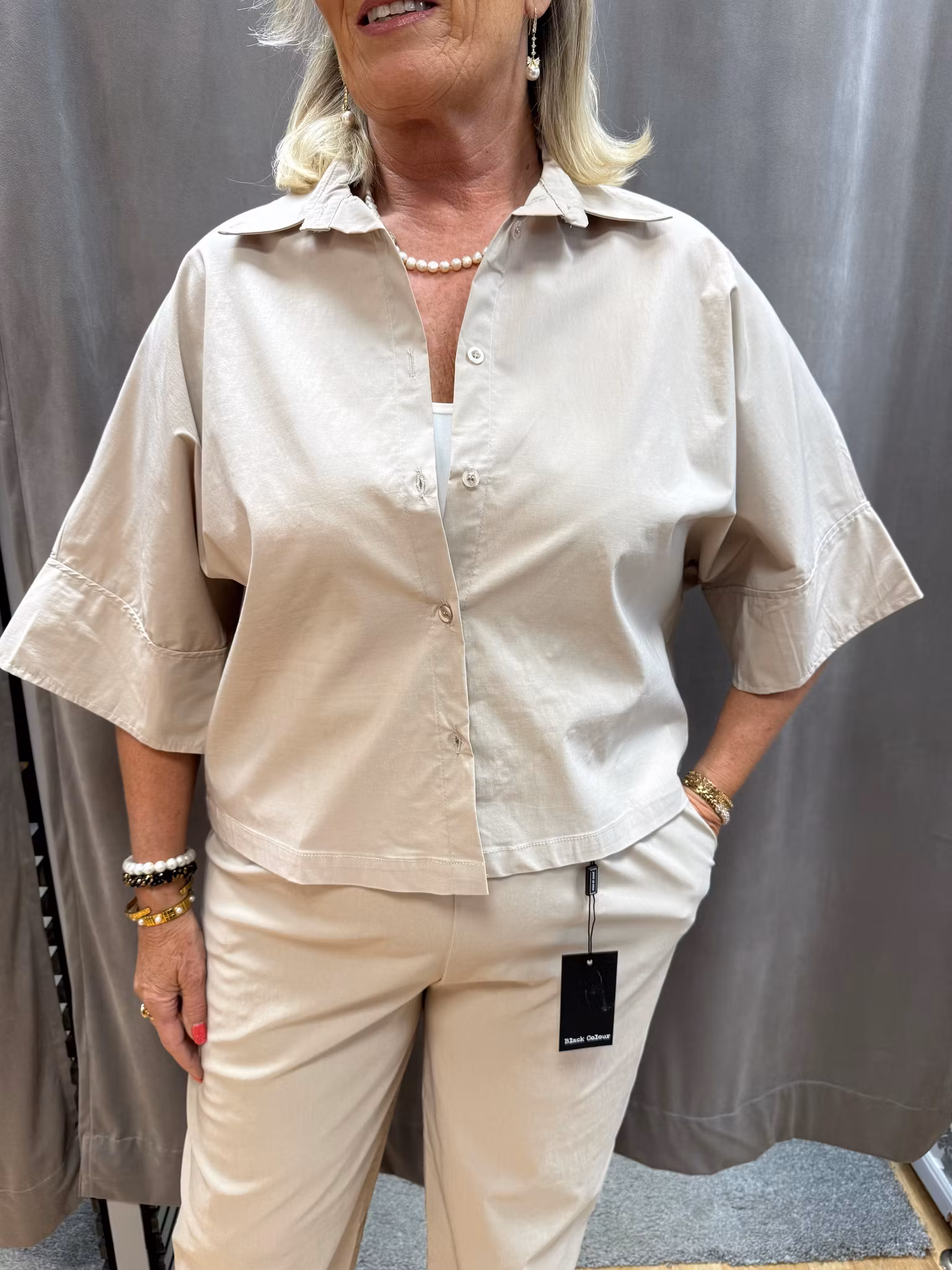 En stilren och lättburen blus med avslappnad silhuett och elegant känsla. Modellen har klassisk skjortkrage och knäppning framtill som ger ett tidlöst uttryck, medan de vida, kortare ärmarna skapar en modern och luftig look.