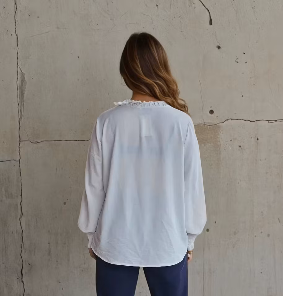 Vit blus med v-ringning och volang