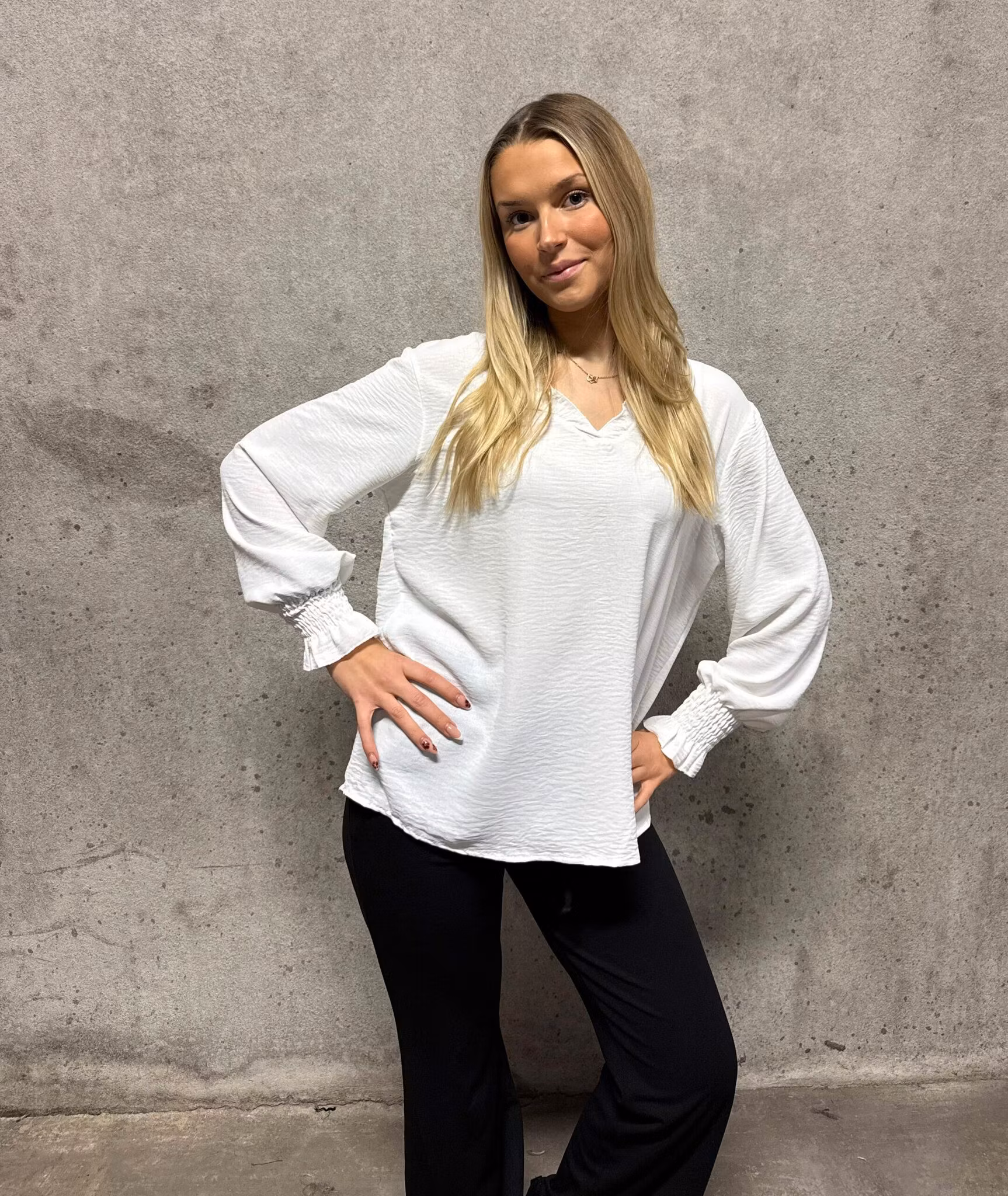 Elegant och lättburen basblus i mjuk viskosmix med vacker V-ringning och smockade ärmslut som ger en feminin och stilren silhuett. Modellen är luftig, följsam och passar lika bra till vardag som till fest.
