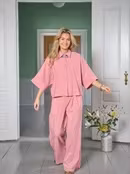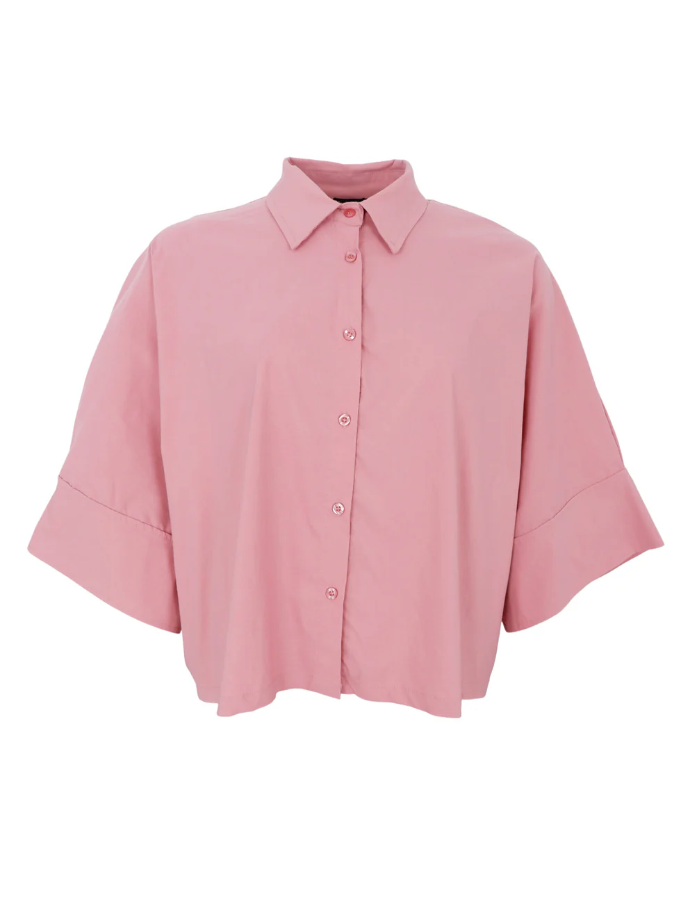 En stilren och lättburen blus med avslappnad silhuett och elegant känsla. Modellen har klassisk skjortkrage och knäppning framtill som ger ett tidlöst uttryck, medan de vida, kortare ärmarna skapar en modern och luftig look.