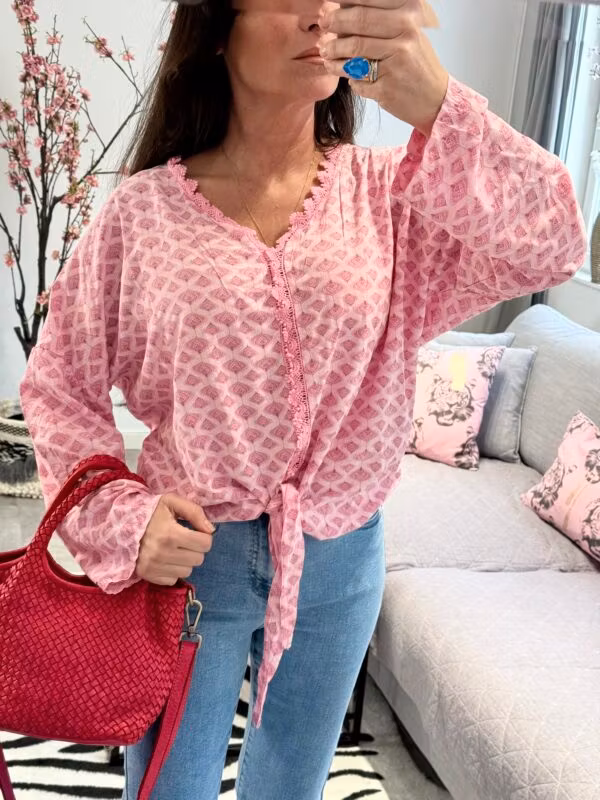 Superhärlig blus i 100% viskos med mjuk och sval känsla som faller vackert på kroppen. Blusen har knyte framtill nedtill så att du enkelt kan justera passformen och skapa den stil du önskar. Vackra spetsdetaljer ger en feminin och romantisk känsla, och det magiskt fina printet gör blusen till ett riktigt blickfång.