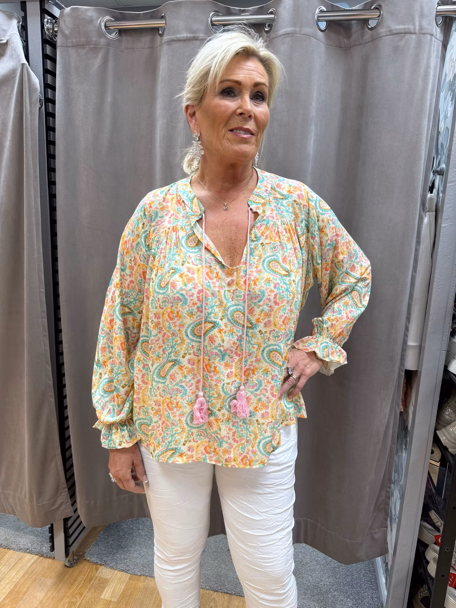 Romantisk, mjuk och tidlös – Susanne Blouse är nu här i ett coolt, mjukt print i paisley. Denna luftiga blus i 100% viskos har en avslappnad passform som passar de flesta kroppstyper. Långa bomullstassels vid halsen kan bäras knutna eller lösa för en personlig look.