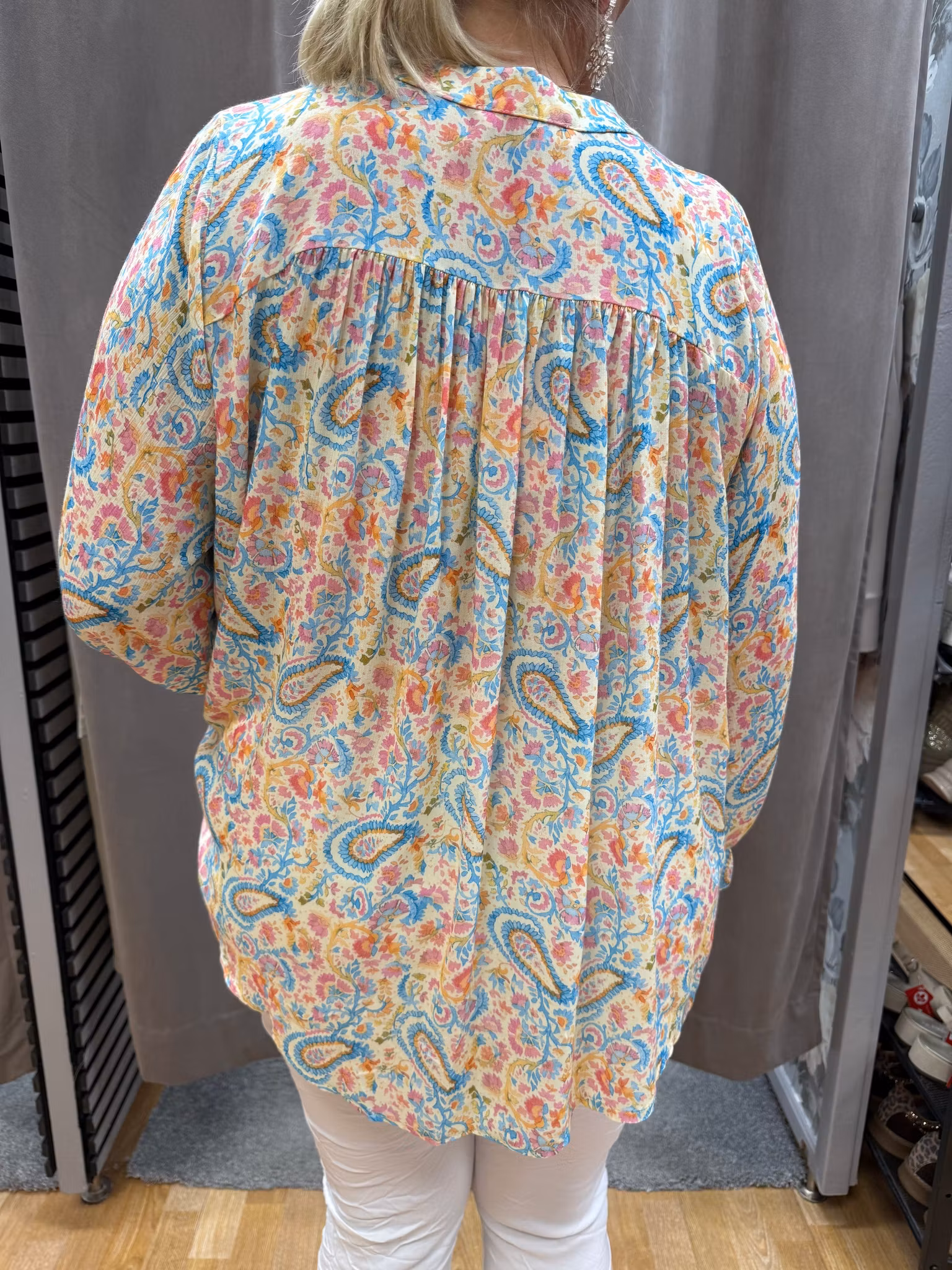 Färg: Ljusgul botten med blått, rosa och orange paisleyprint