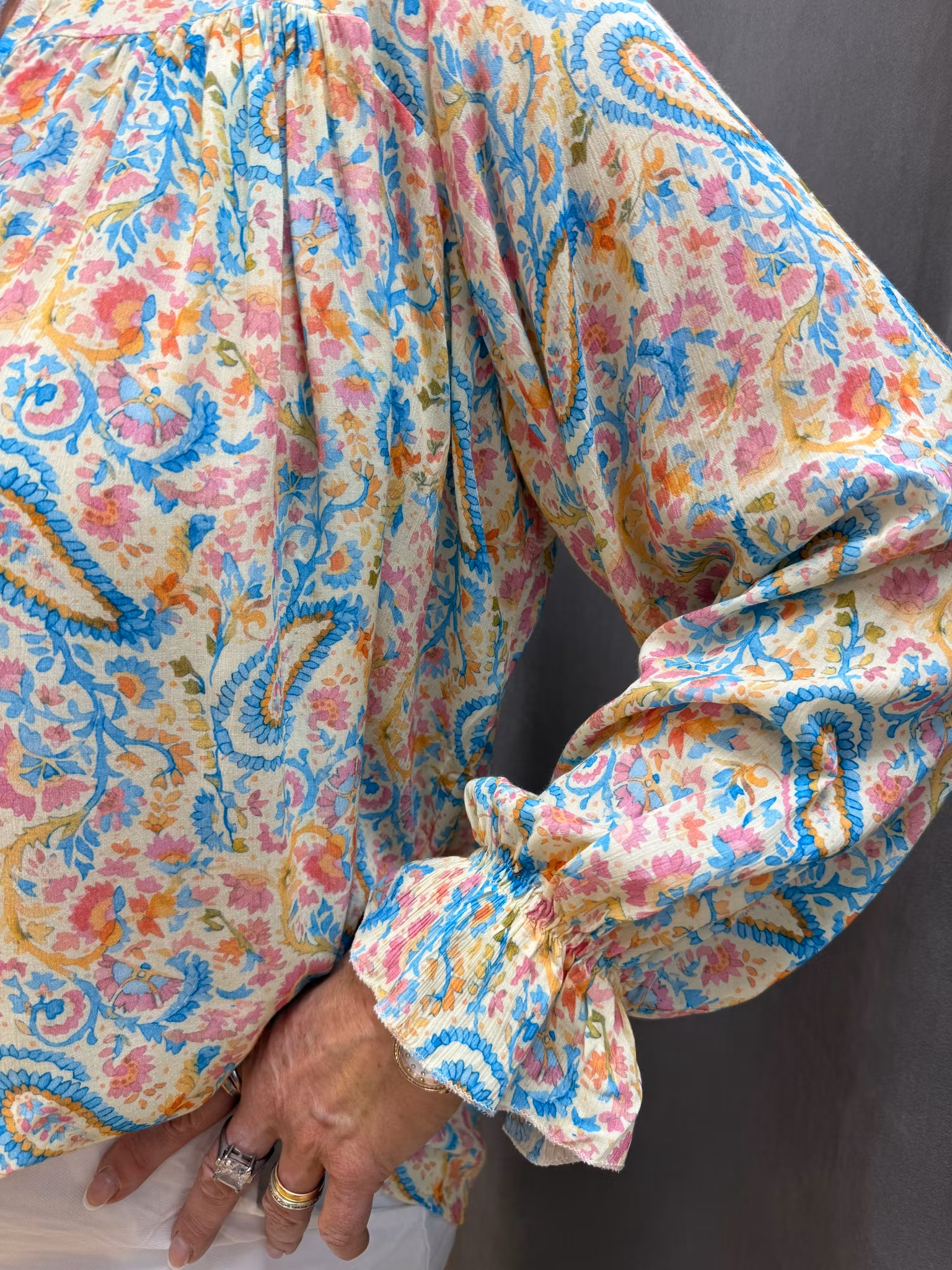 Romantisk, mjuk och tidlös – Susanne Blouse är nu här i ett coolt, mjukt print i paisley. Denna luftiga blus i 100% viskos har en avslappnad passform som passar de flesta kroppstyper. Långa bomullstassels vid halsen kan bäras knutna eller lösa för en personlig look.