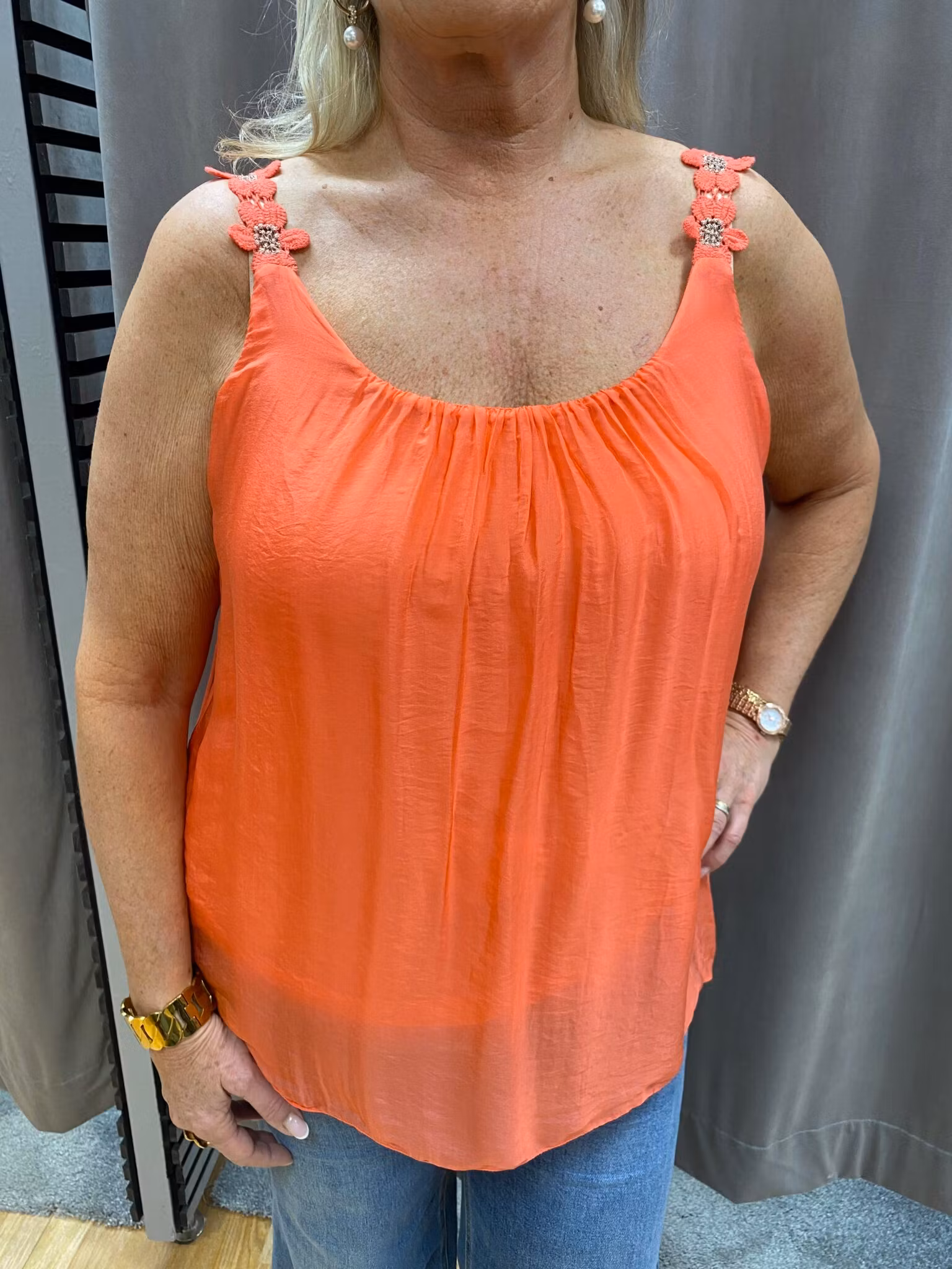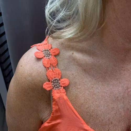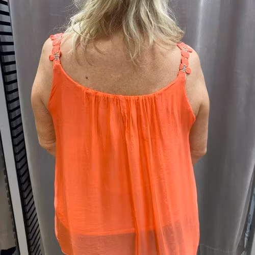 Sött linne med blommor på axelbanden. Innersta tyget är ett trikåtyg i Viskos 95% Elastan 5% Yttersta tyget är ett skirt tyg i 70% viskos 30% siden Modellen är 172cm och bär storlek L/XL