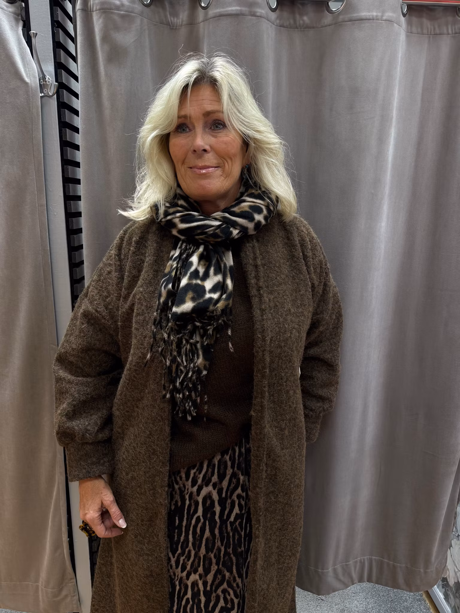 En stilren och mysig långkofta i brunt som blir ett perfekt lagerplagg för kyliga dagar. Koftan har en öppen modell utan knäppning, vilket gör den enkel att styla över både tröjor, blusar och klänningar.