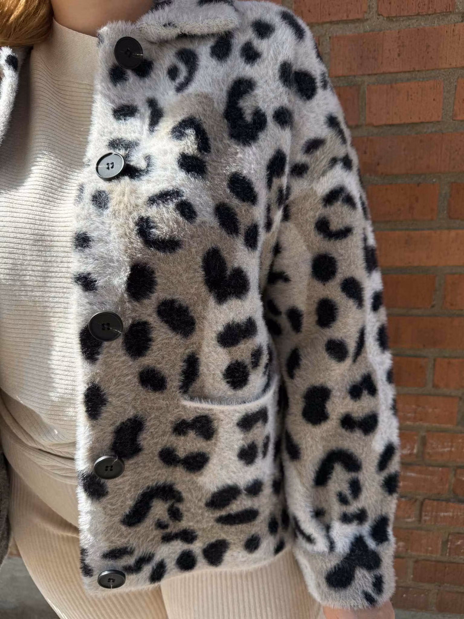 Trendig kofta i mjukt material med leopardmönster. Koftan har klassisk krage, knäppning fram med stora knappar och praktiska fickor. En stilfull statement-kofta som lyfter varje outfit – perfekt för både vardag och kväll.