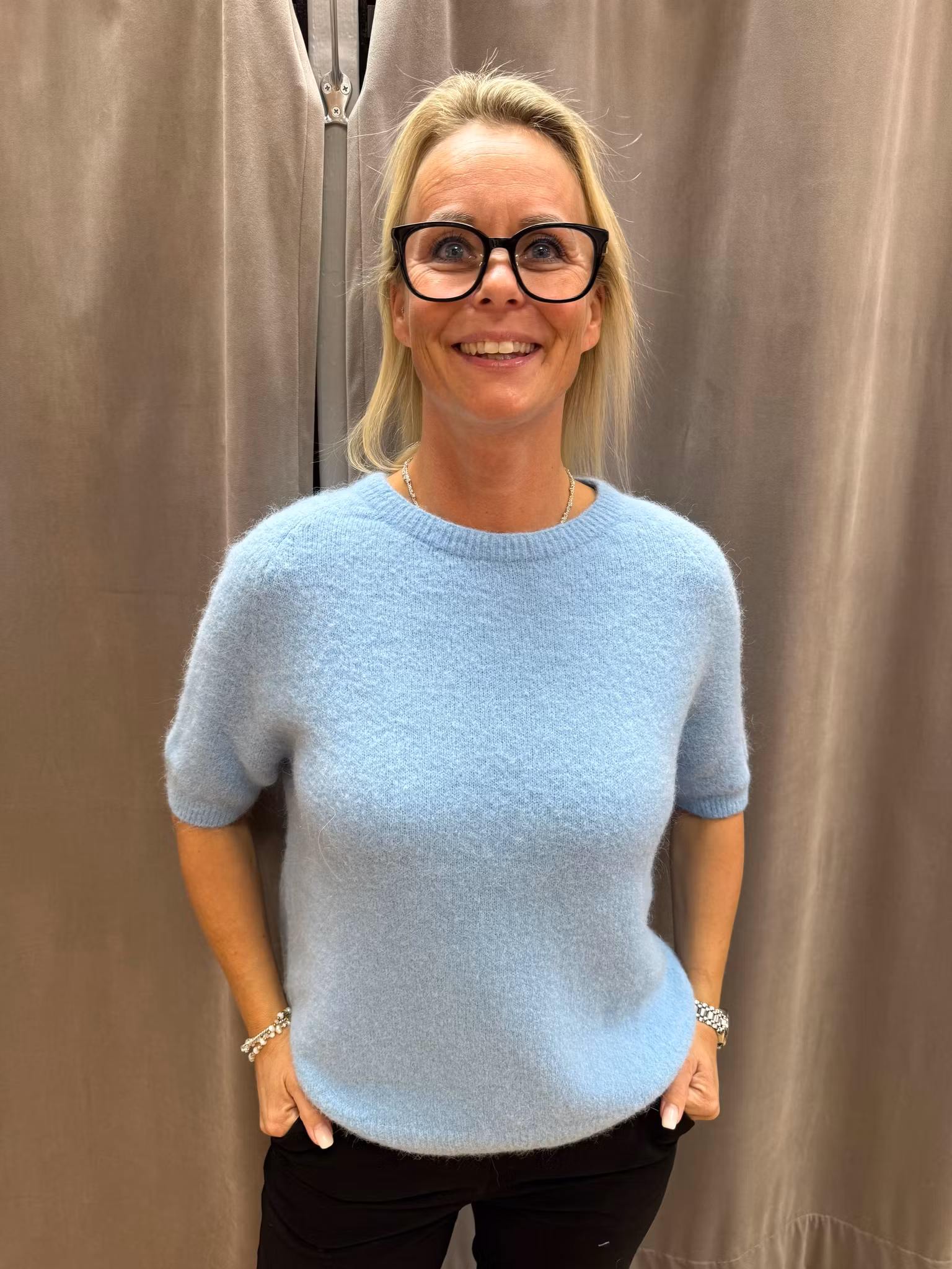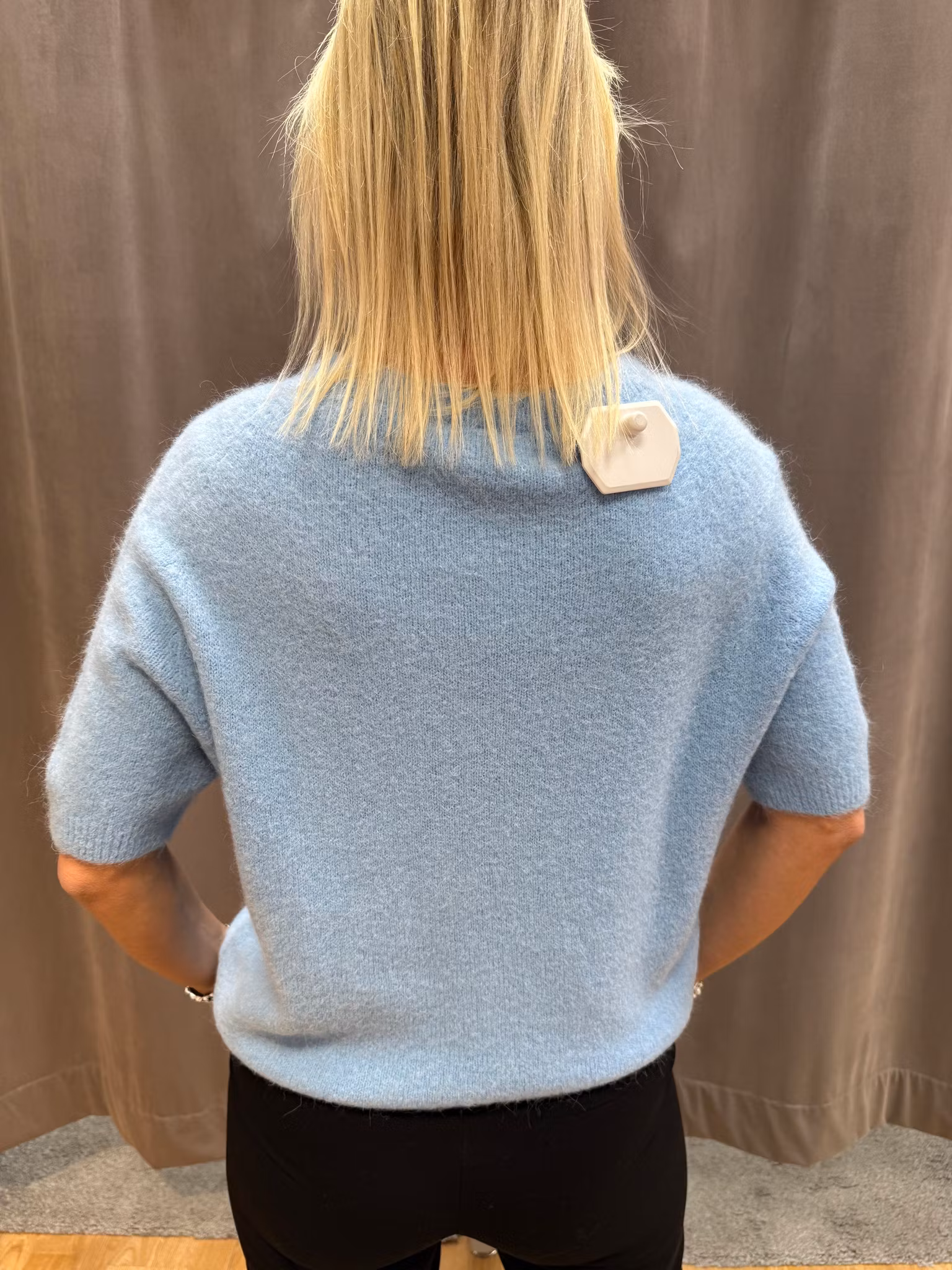 Mjuk och fluffig stickad tröja i en fräsch ljusblå ton. Modellen har rund halsringning och korta ärmar, vilket gör den perfekt för både vår och sommar. Den avslappnade passformen gör den lätt att bära till både jeans, kjol eller under en kavaj för en mer uppklädd look.