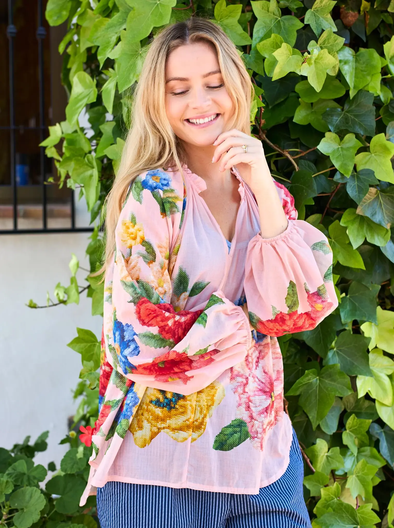 En feminin och färgstark bomullsblus som andas lätthet och sommar. Blusen är i Onesize och har en lös och luftig passform med långa ärmar och resår vid handlederna, vilket skapar en mjuk och voluminös silhuett.