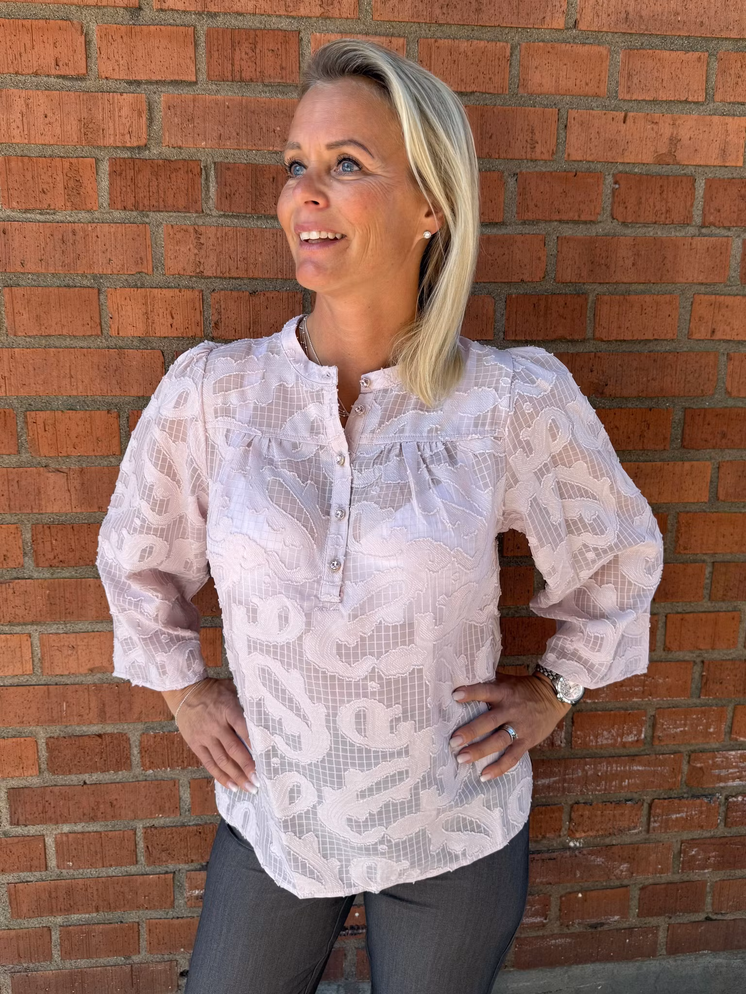 Ljusrosa blus med strukturmönster. Feminin och stilfull ljusrosa blus i transparent tyg med vackert strukturmönster. Modellen har knappar upptill, puffärmar och en avslappnad passform som ger både komfort och elegans. Perfekt att bära till kostymbyxor, kjol eller jeans – lika snygg till vardag som till fest.