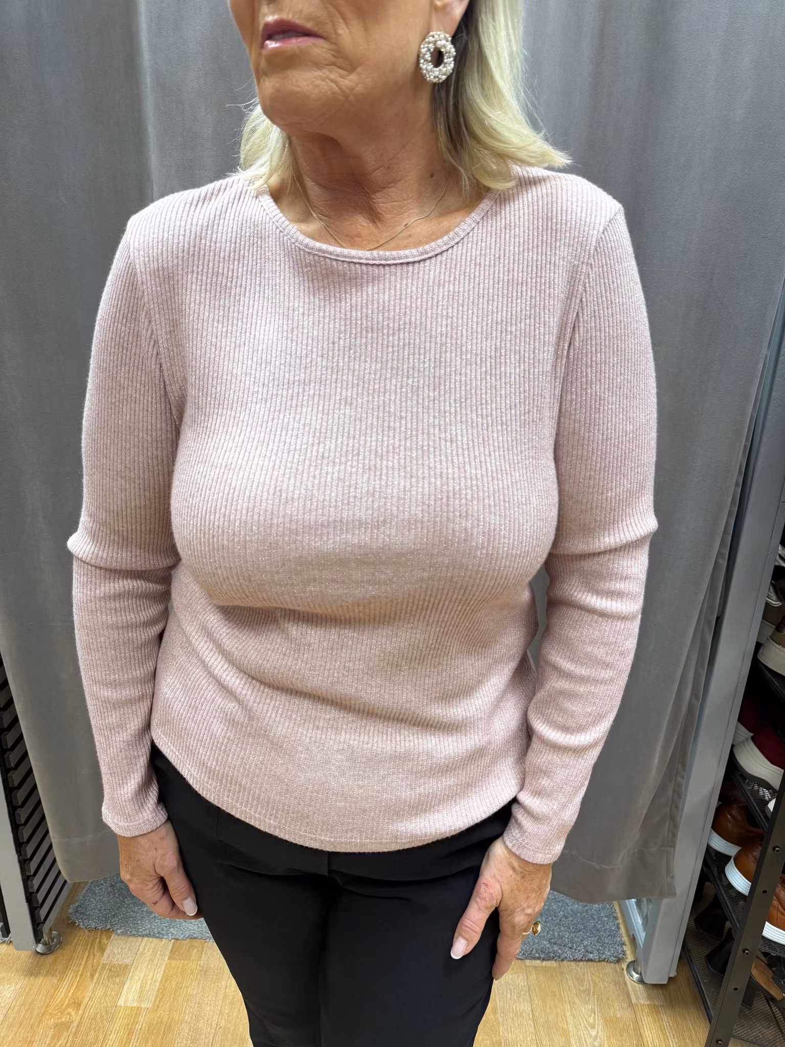 Ribbad långärmad topp med diskret glitter som ger en elegant och festlig känsla. Materialet är mjukt, följsamt och sitter bekvämt mot huden samtidigt som den ribbade strukturen skapar en smickrande siluett. Toppen fungerar lika bra till vardags som till kvällen och kan enkelt matchas med både kjol och byxor. Finns i ljusrosa och brun för att passa olika stilar och tillfällen.
