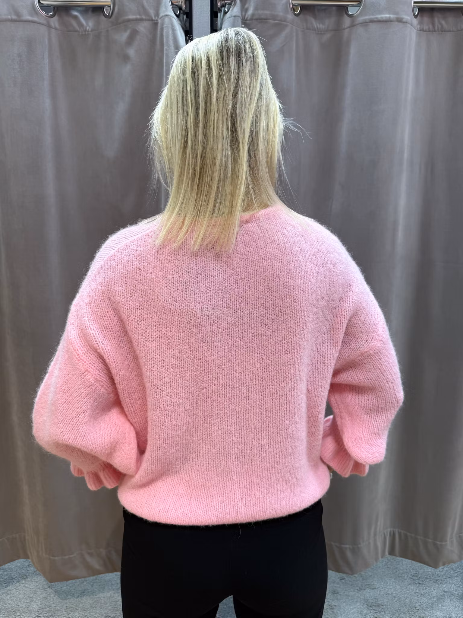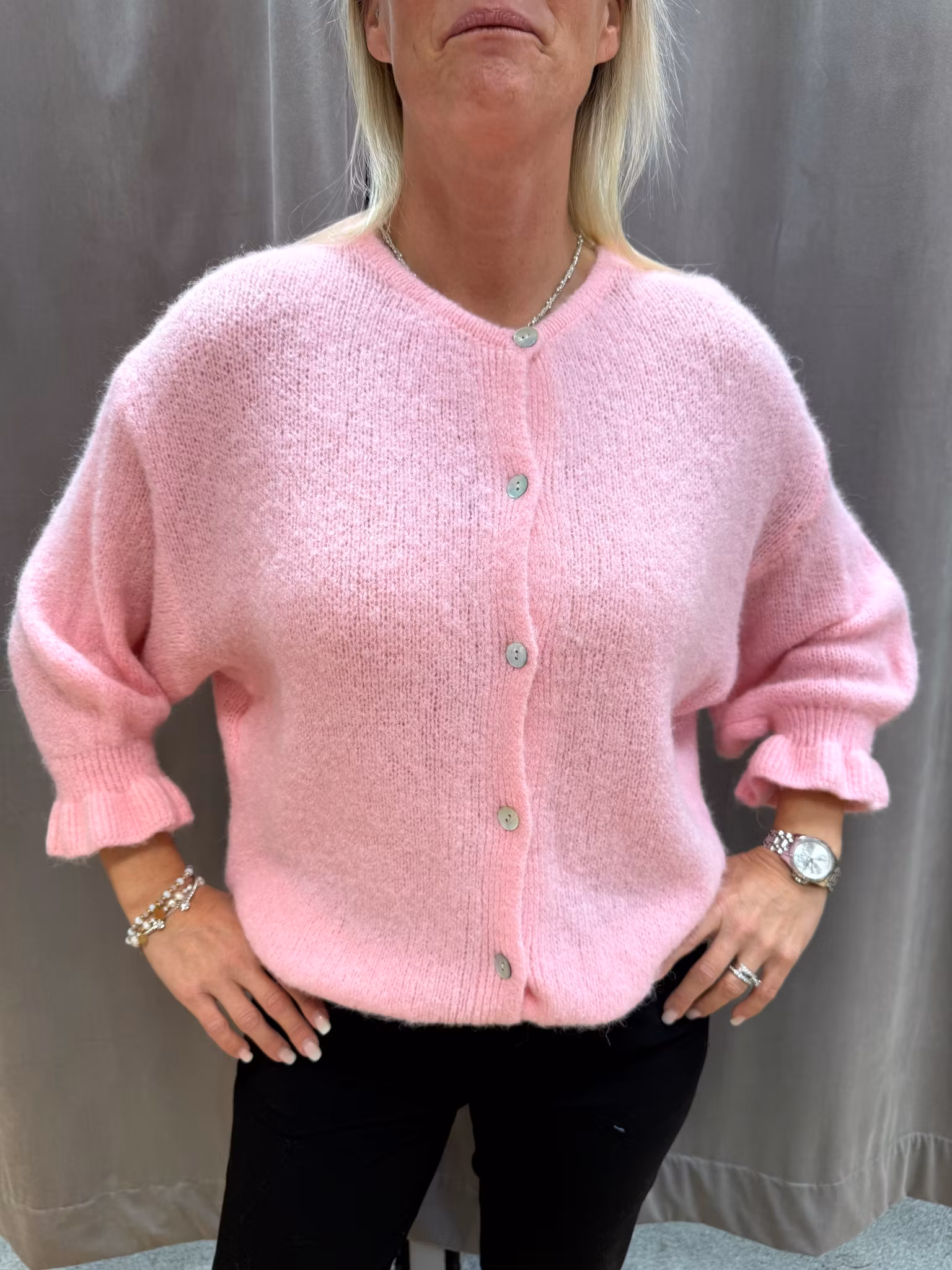 Mjuk och mysig stickad kofta i en härlig rosa färg. Modellen har rund halsringning, knäppning framtill och ribbade muddar med söt volangdetalj vid ärmslutet. En feminin och trendig vardagsfavorit som passar lika bra till jeans som över en klänning.