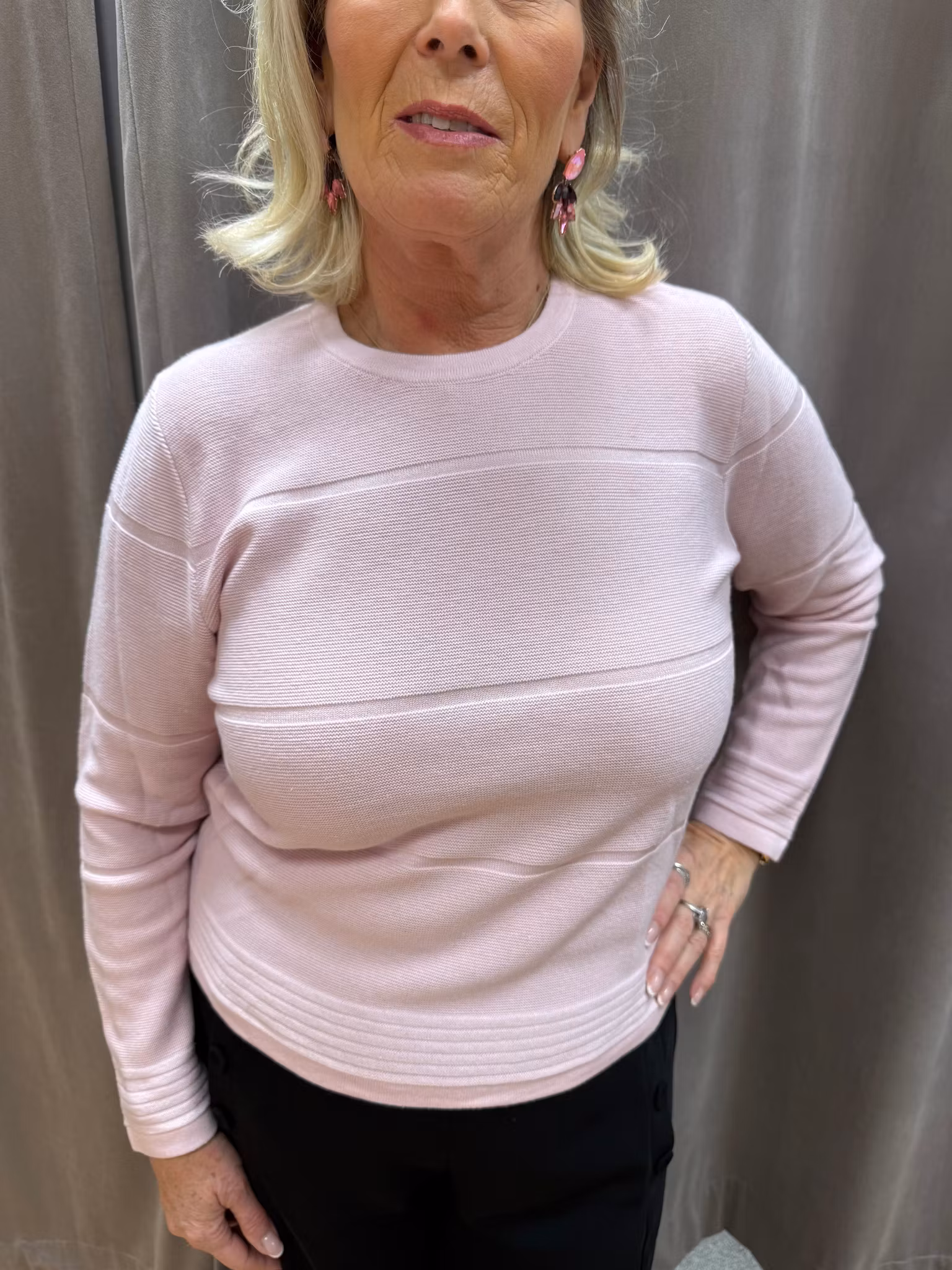 Ljusrosa stickad tröja i mjuk och strukturerad kvalitet med dekorativa horisontella ribbdetaljer över byst, ärmar och nederkant. Tröjan har rund halsringning, långa ärmar och en bekväm, något figurnära passform som ger ett stilrent och modernt uttryck. Det subtila mönstret i stickningen ger plagget extra karaktär samtidigt som färgen håller looken feminin och tidlös. Perfekt för både vardag och kontor.