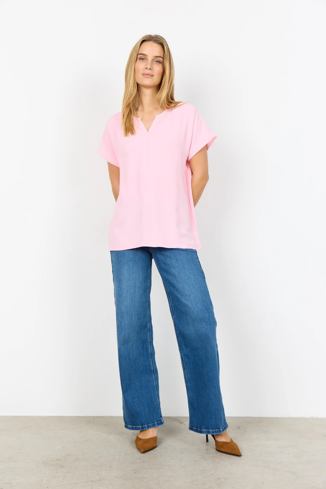 T-shirt tillverkad av 100% polyester. Den har korta ärmar, en subtil V-ringning och en fin textur som ger en unik touch. Kombinera den med skräddarsydda byxor och statementsmycken för en raffinerad look.