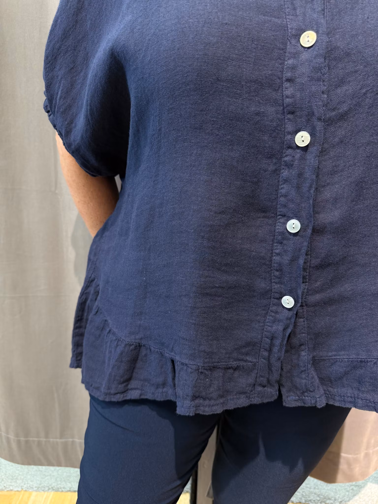 Marinblå linneskjorta med volang