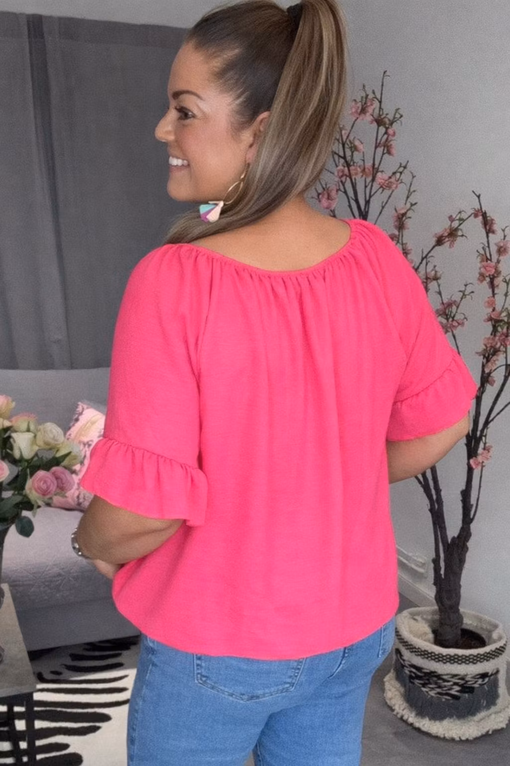 Fantastiskt fin blus i mjukt och följsamt tyg som faller snyggt och ger en smickrande siluett. Resår upptill gör att du själv kan välja om du vill bära den klassiskt på axlarna eller trendigt off-shoulder. Ärmarna avslutas med söt volang som ger en feminin känsla.