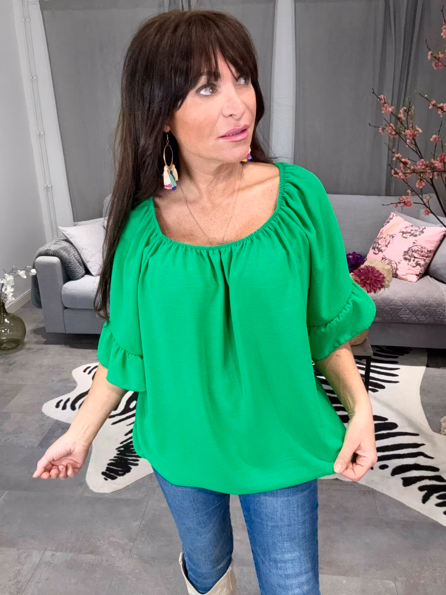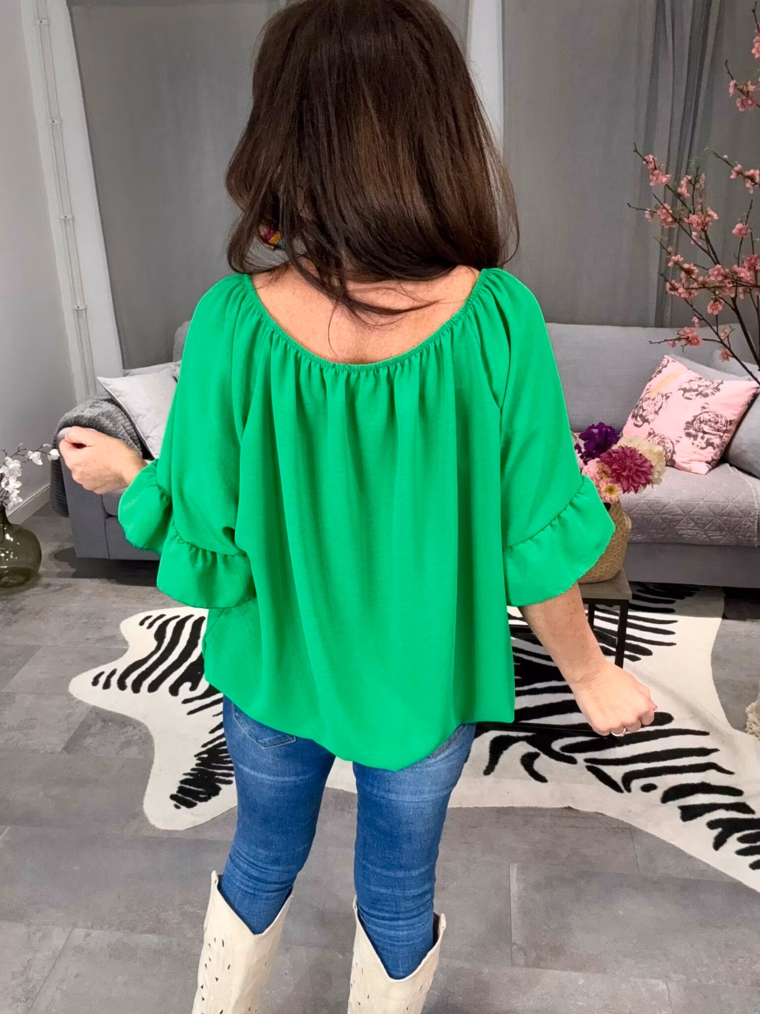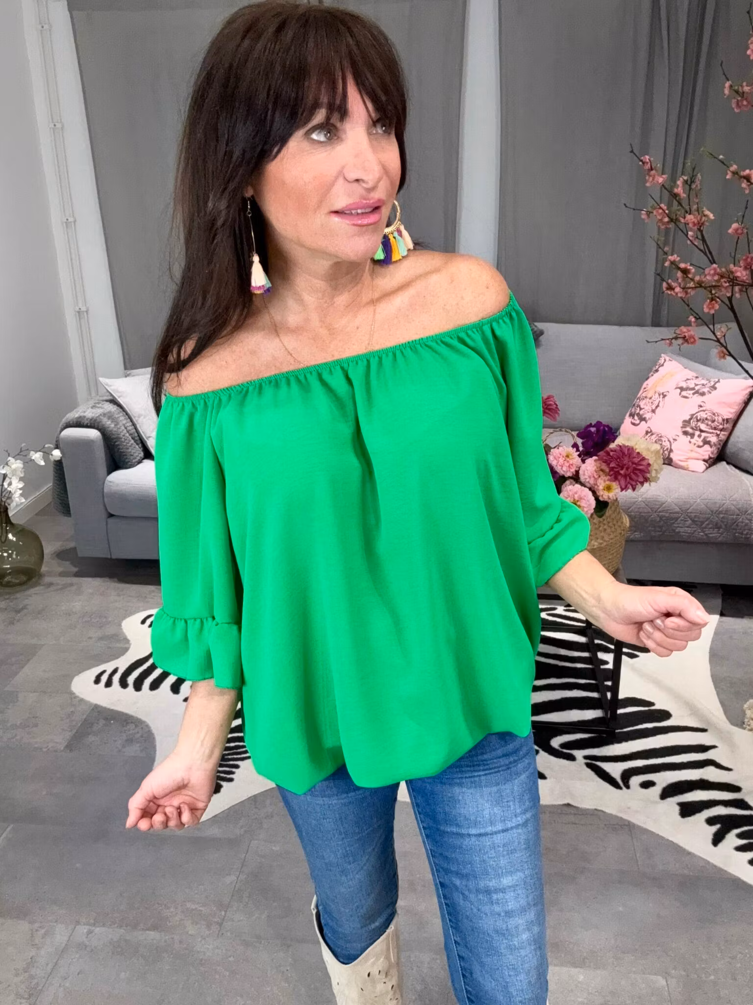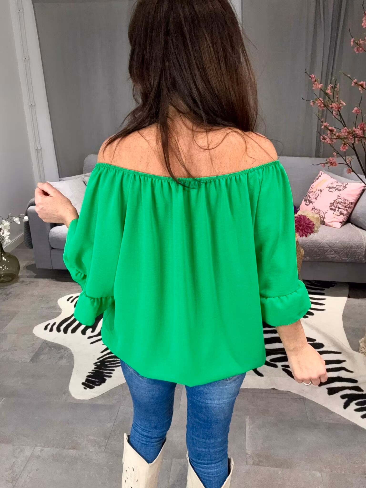 Fantastiskt fin blus i mjukt och följsamt tyg som faller snyggt och ger en smickrande siluett. Resår upptill gör att du själv kan välja om du vill bära den klassiskt på axlarna eller trendigt off-shoulder. Ärmarna avslutas med söt volang som ger en feminin känsla.