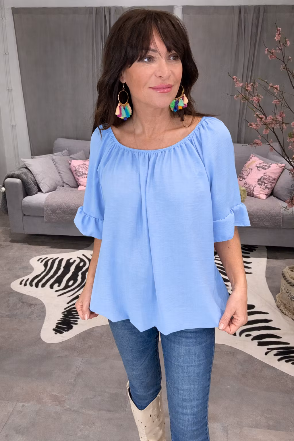 Fantastiskt fin blus i mjukt och följsamt tyg som faller snyggt och ger en smickrande siluett. Resår upptill gör att du själv kan välja om du vill bära den klassiskt på axlarna eller trendigt off-shoulder. Ärmarna avslutas med söt volang som ger en feminin känsla.