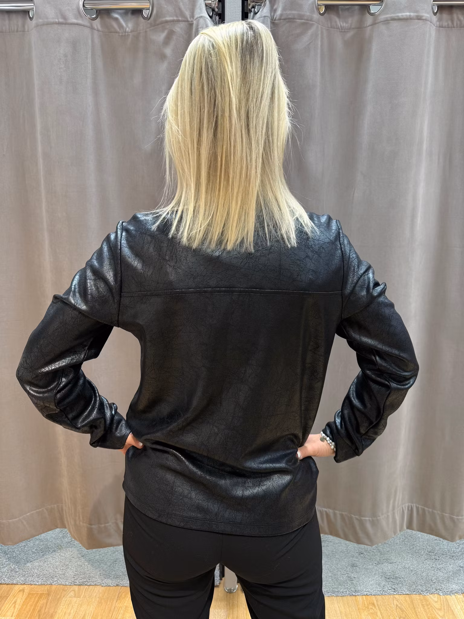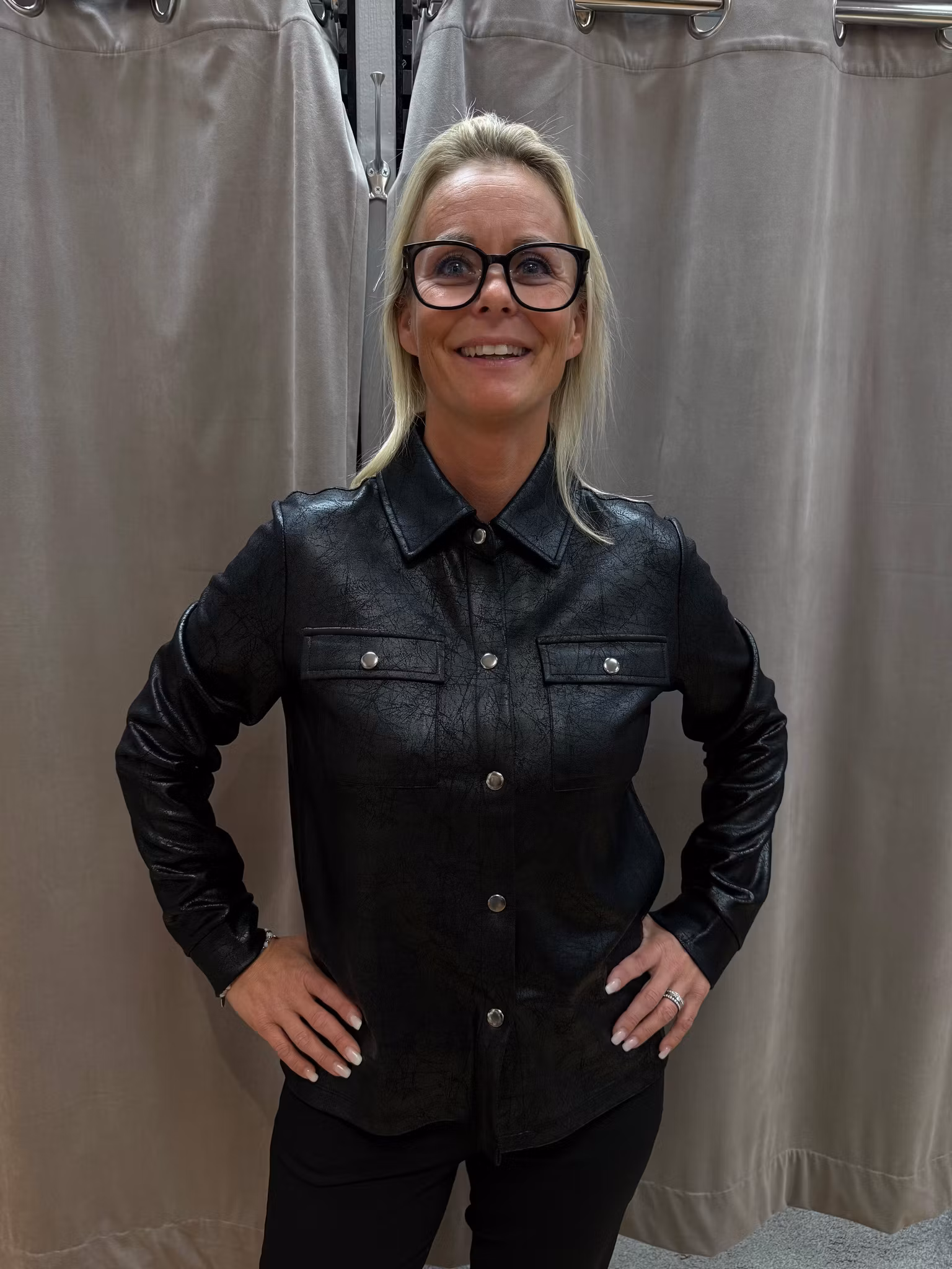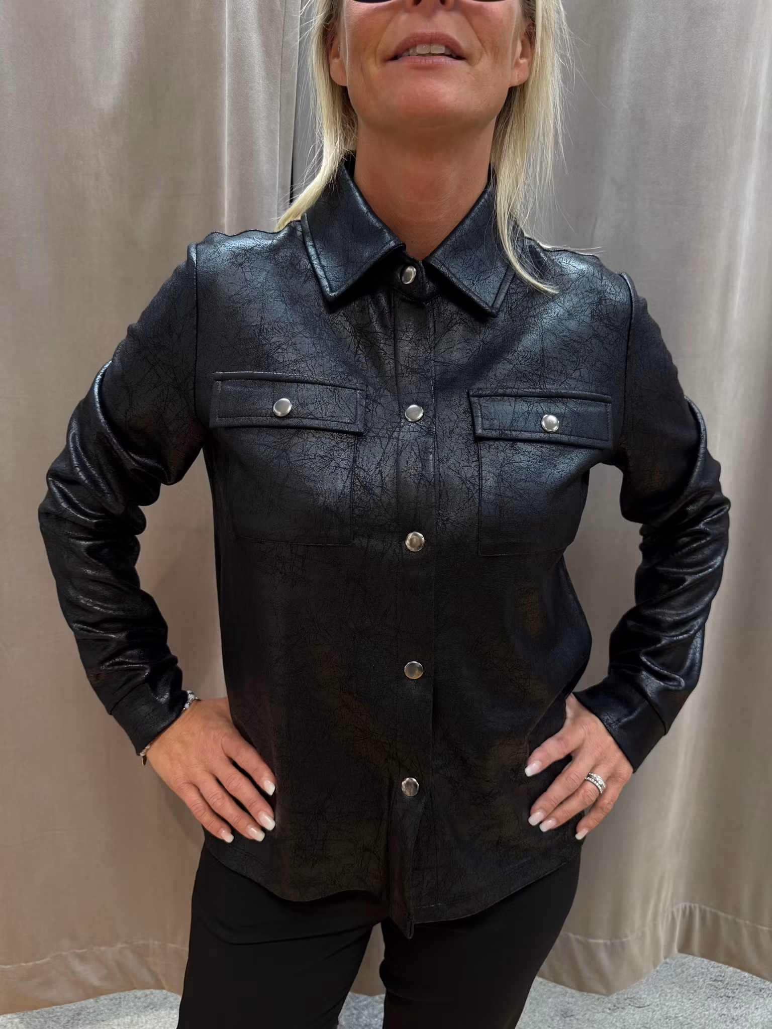 Trendig skjortjacka i svart skinnimitation med lätt glans och dekorativ struktur. Modellen har klassisk krage, tryckknappar framtill och två bröstfickor med lock. Perfekt att bära som en lätt jacka eller som en stilsäker skjorta för en cool vardagslook.