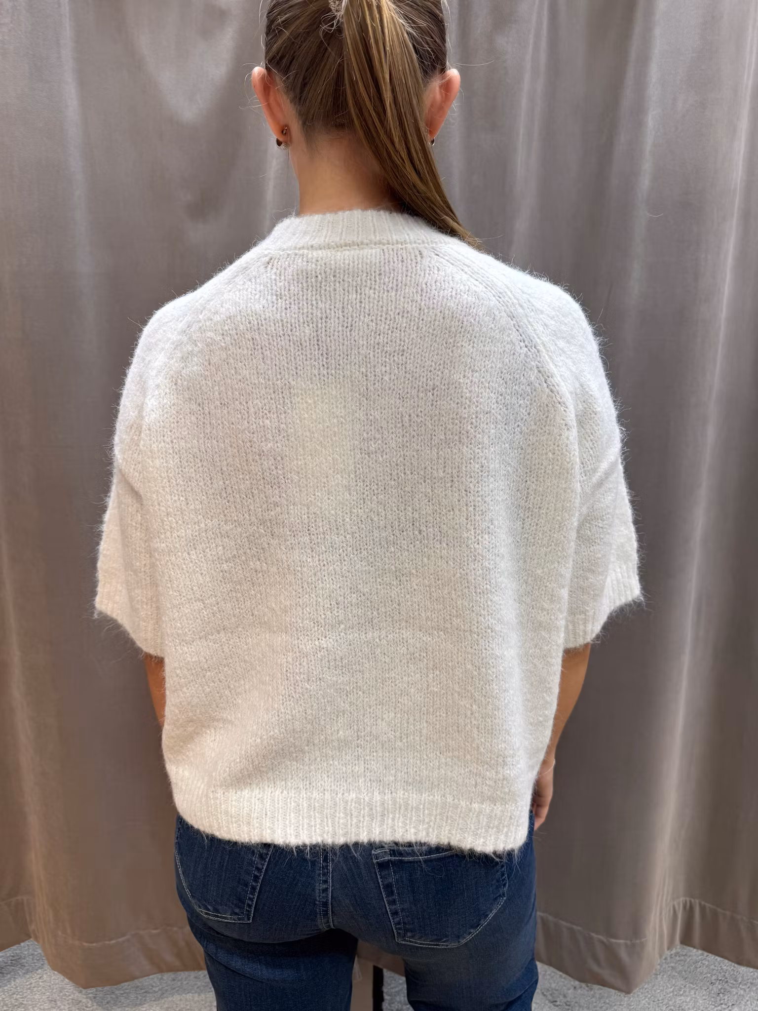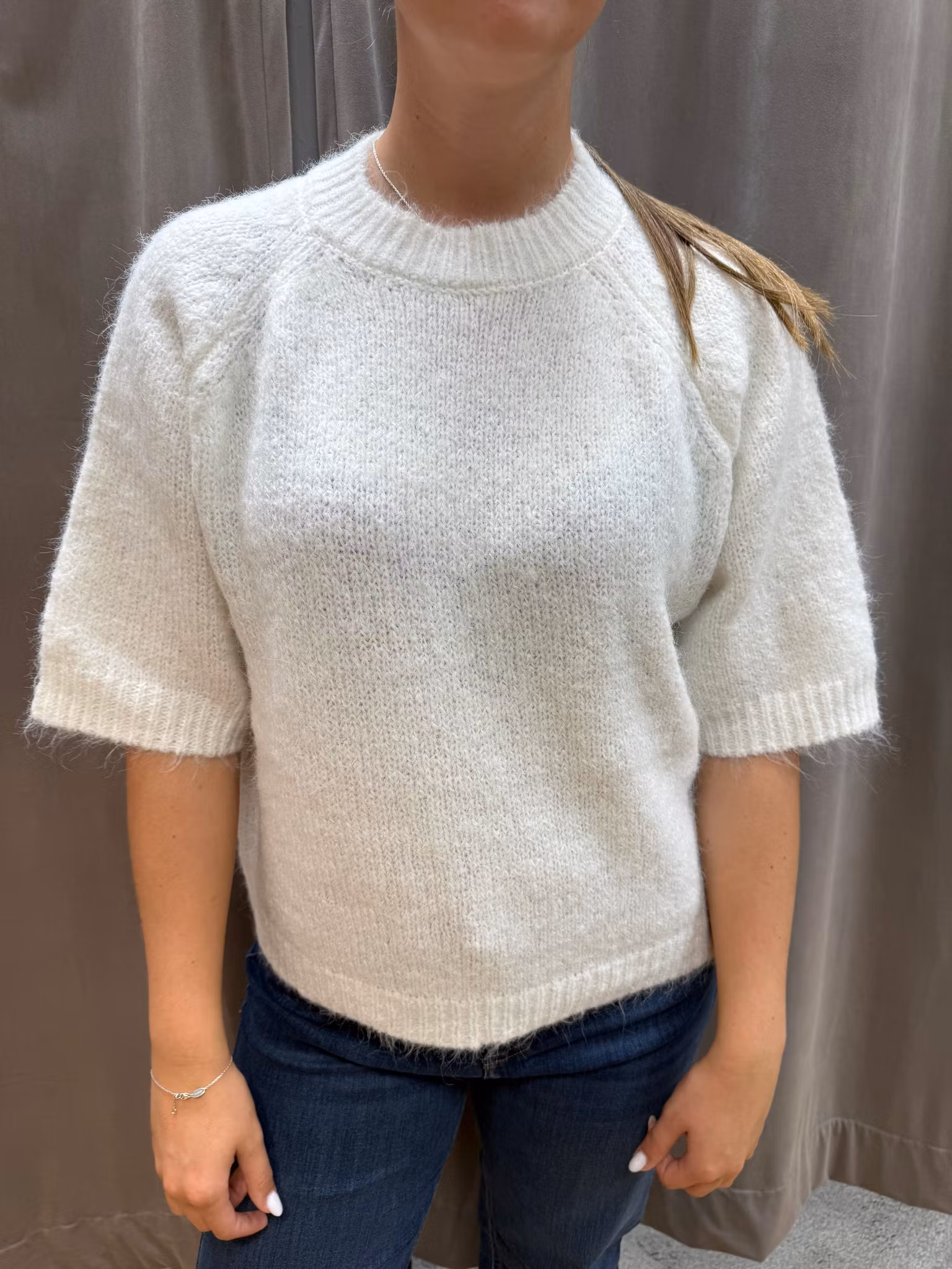 Trendig stickad tröja i mjukt garn med korta ärmar och rund halsringning. Den offwhite tröjan har en luftig och modern passform som gör den perfekt att bära både till jeans och kjol. Ett stilrent plagg som fungerar året runt – lika snyggt ensam som i lager på lager.