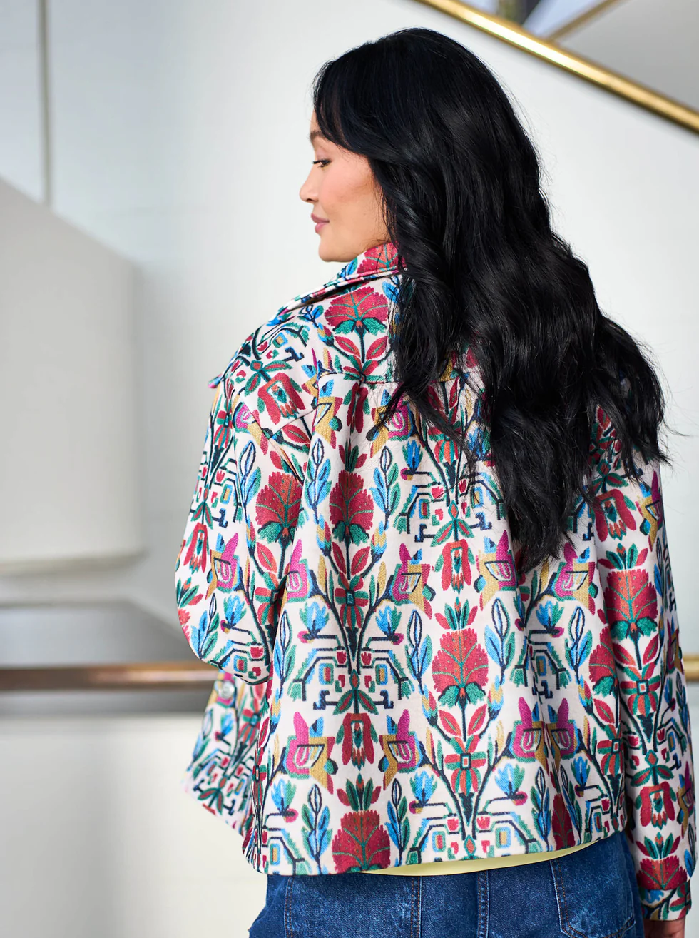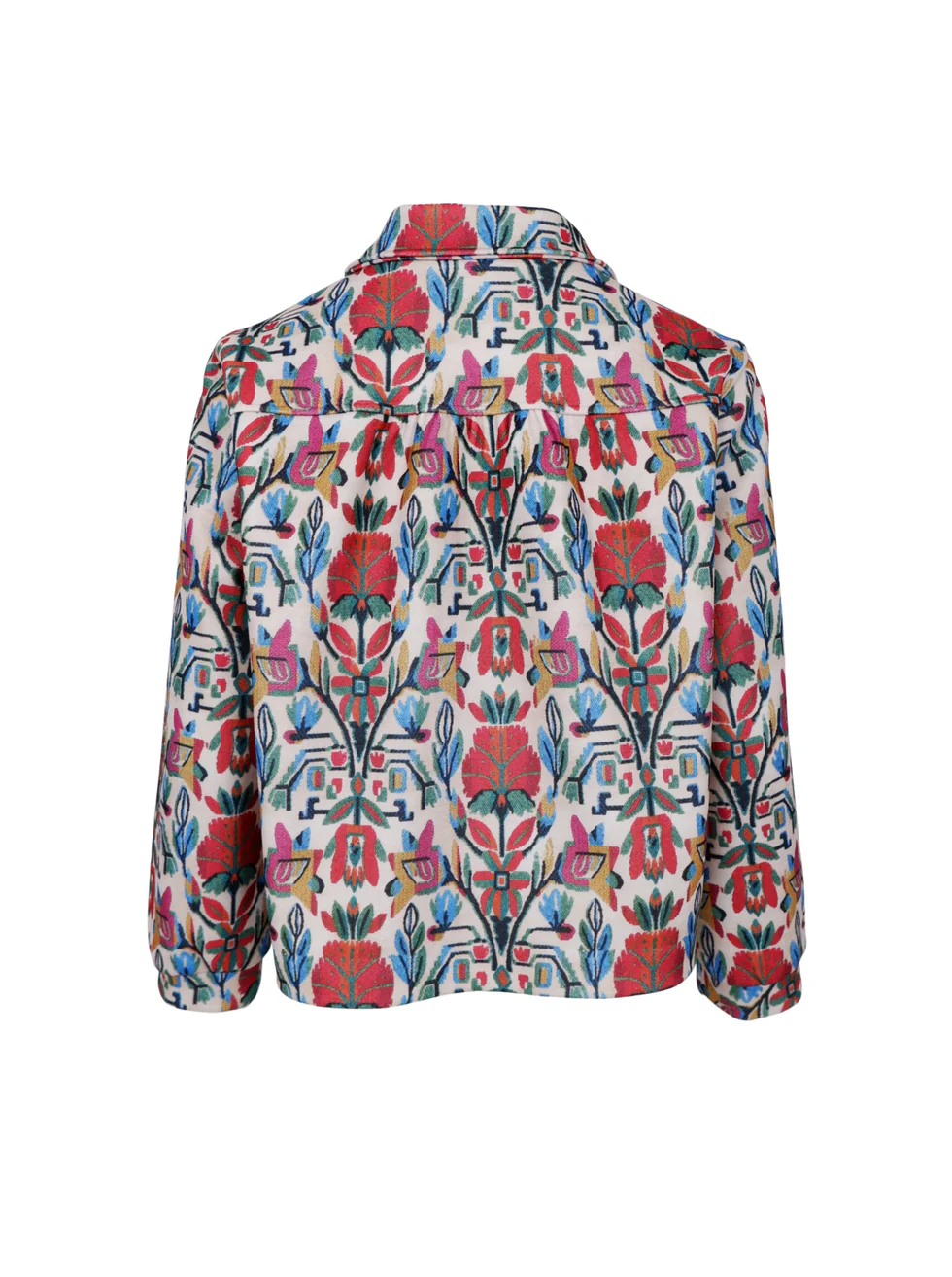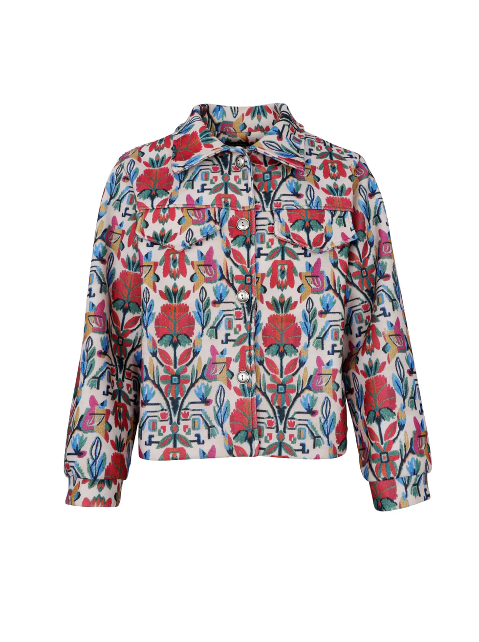 Stilfull jacka i en kortare, rak modell med dekorativt mönster som ger ett personligt och modernt uttryck. Jackan har klassisk krage, knäppning framtill och praktiska bröstfickor som förstärker den tidlösa känslan. Den något strukturerade kvaliteten ger ett fint fall och gör plagget lika snyggt öppet som stängt. Perfekt som lager-på-lager över toppar och blusar – ett plagg som lyfter både vardags- och helhetslooken.