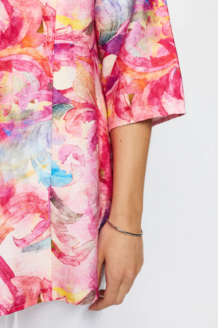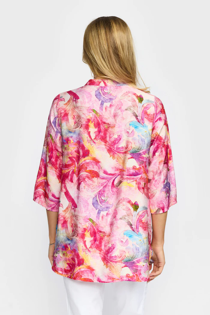 En färgstark och feminin skjortblus i ett livfullt mönster med inslag av rosa, korall, blått och mjuka pastelltoner. Blusen har en avslappnad passform som ger både komfort och ett elegant fall.