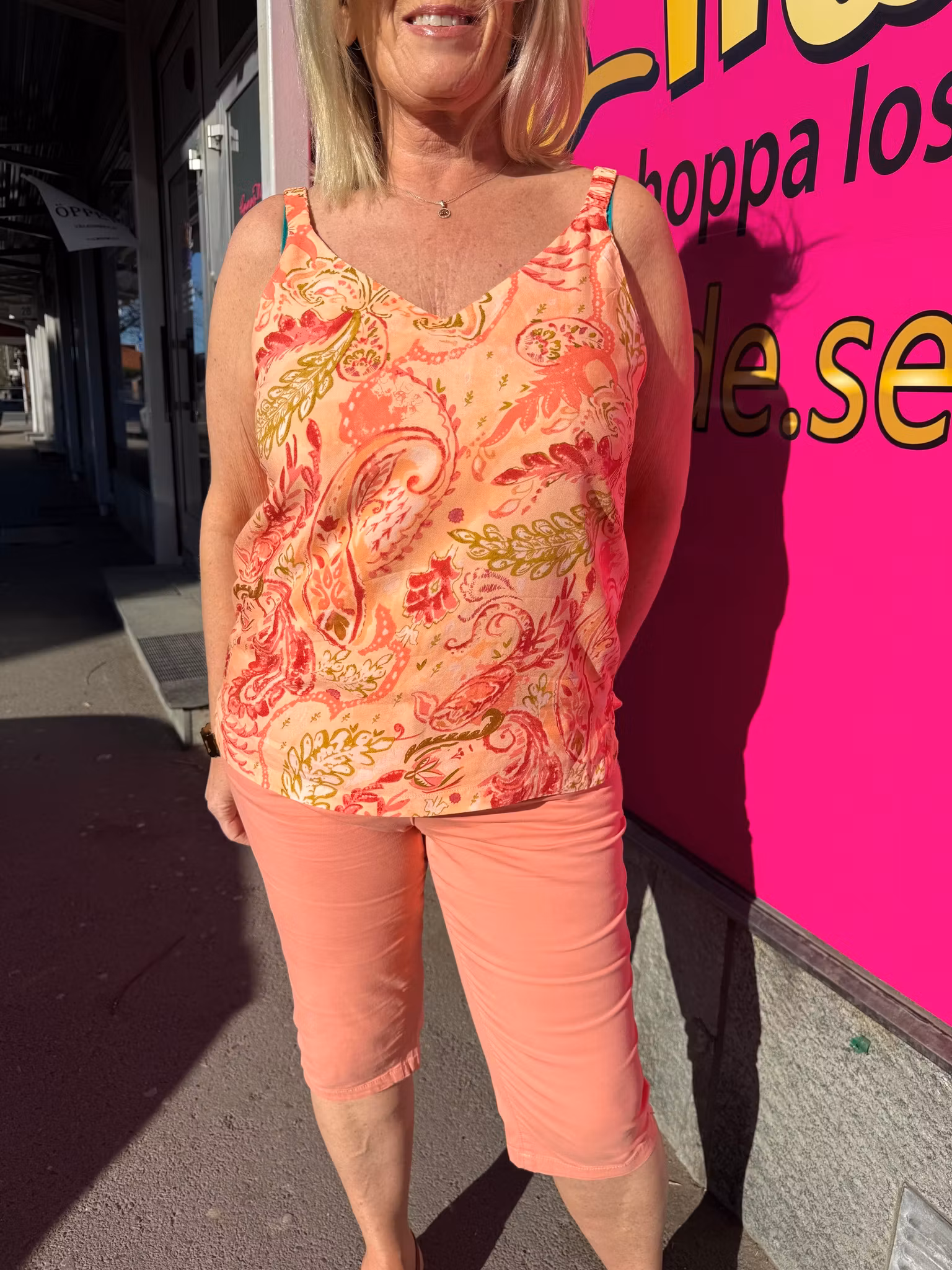 Opp tillverkad av 100% LENZING™ ECOVERO™ viskos. Toppen har en ärmlös design med en djup V-ringning och ett djärvt, konstnärligt tryck. Kombinera den med skräddarsydda byxor för en elegant kontorslook eller med jeans för en mer avslappnad look.
