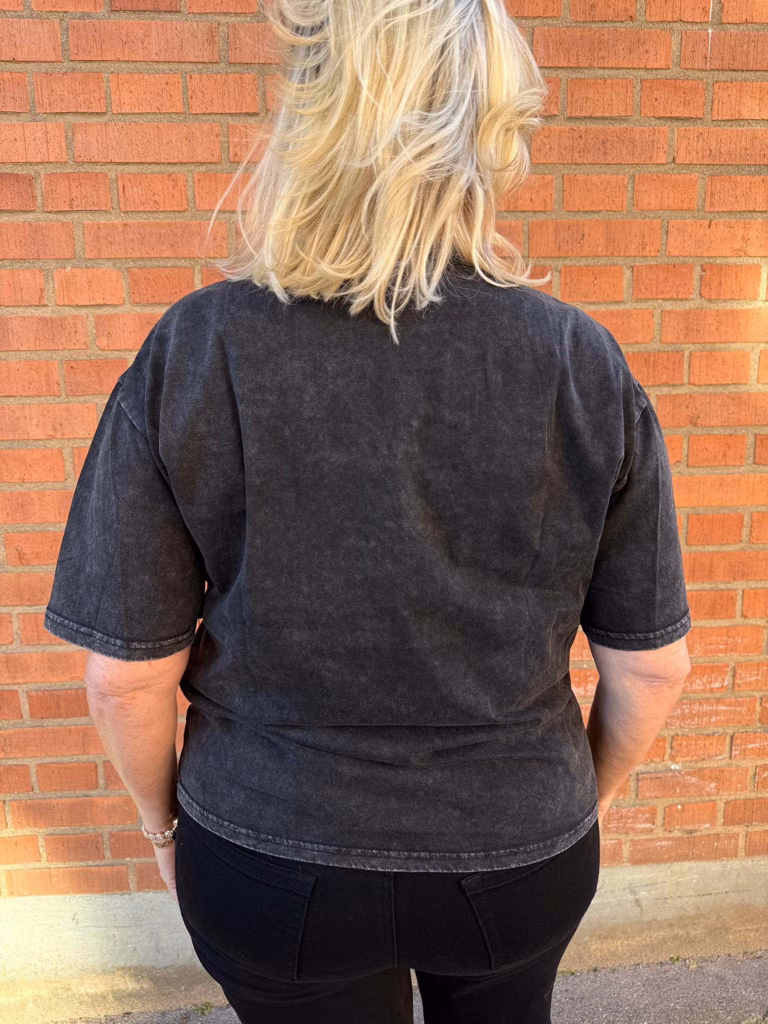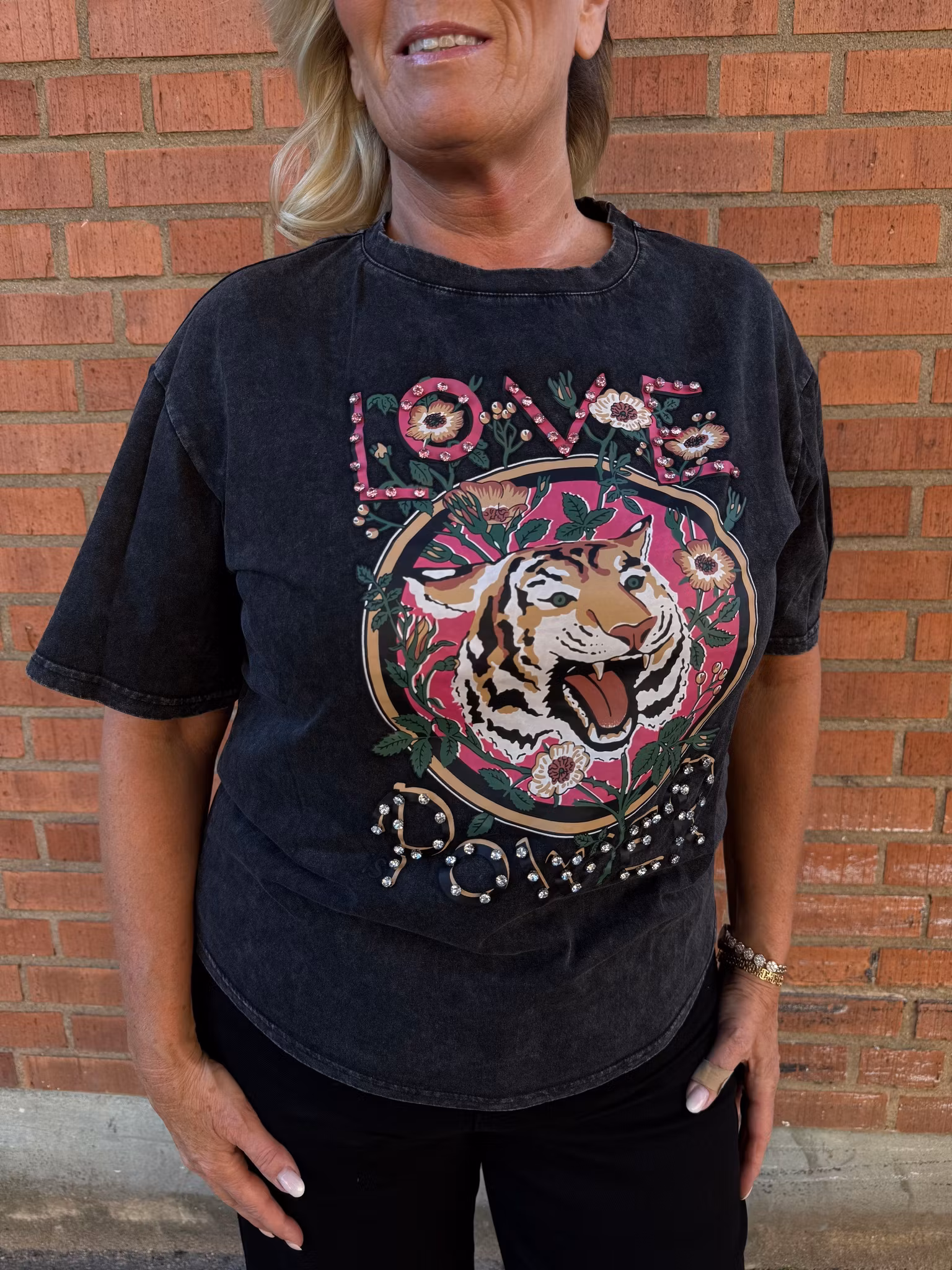 Här ser vi en svart t-shirt i tvättad vintage-stil. Framtill finns ett stort färgglatt tryck med en tiger, blommor och texten “LOVE POWER”. Både bokstäverna och vissa detaljer i motivet är dekorerade med små pärlor/strass som ger extra effekt. One size