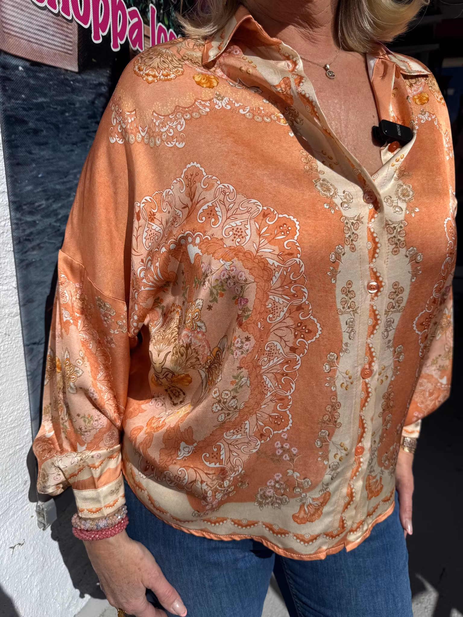 En vacker skjortblus med ett rikt, dekorativt mönster inspirerat av klassiska ornament och bohemiska detaljer. Den harmoniska designen ger ett mjukt och exklusivt uttryck som lyfter vilken outfit som helst.