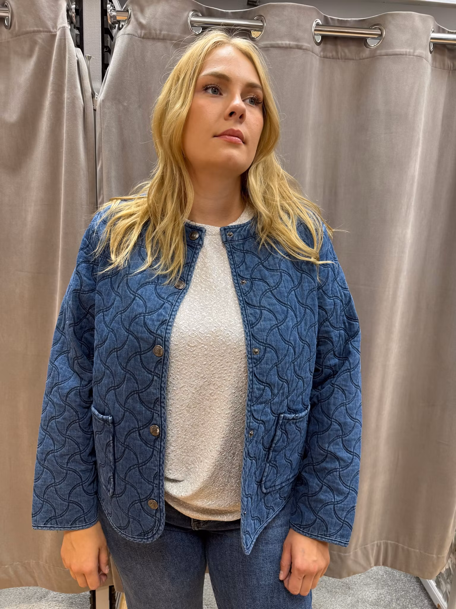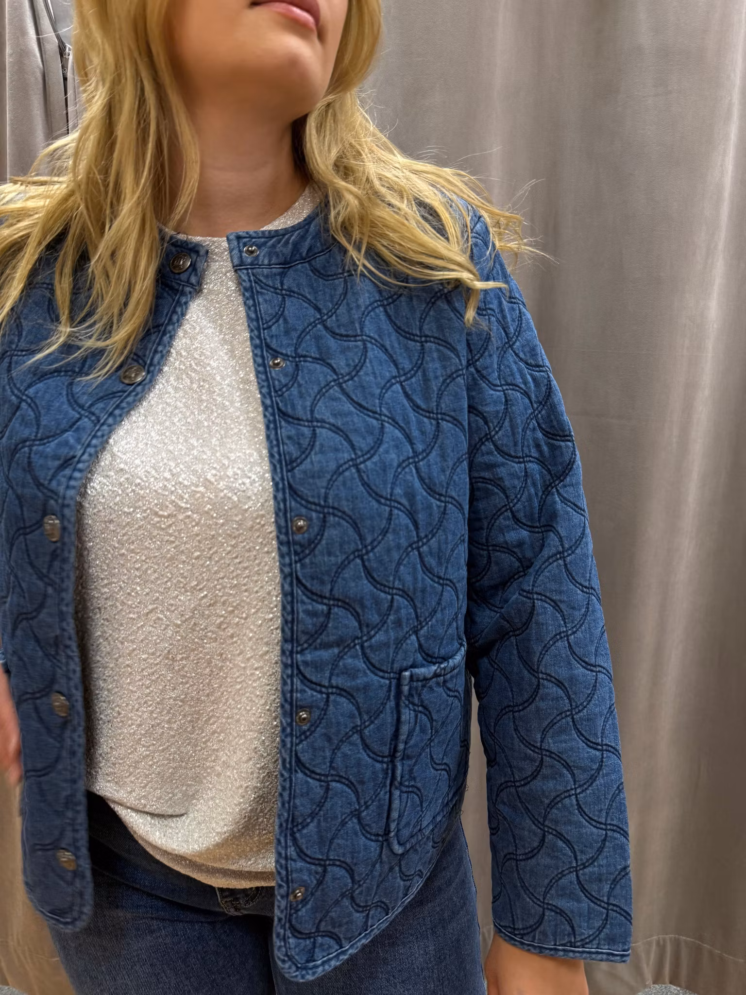 Quiltad jeansjacka med rund hals och tryckknappar framtill. Jackan har dekorativa vågiga sömmar som ger en unik struktur och en modern twist på den klassiska denimlooken. Utrustad med fickor framtill för både stil och funktion. En mångsidig jacka som passar lika bra till vardags som till en mer dressad outfit.