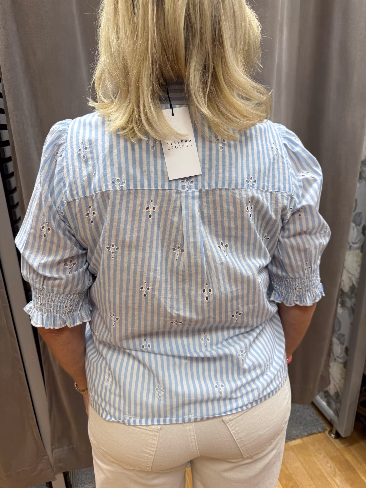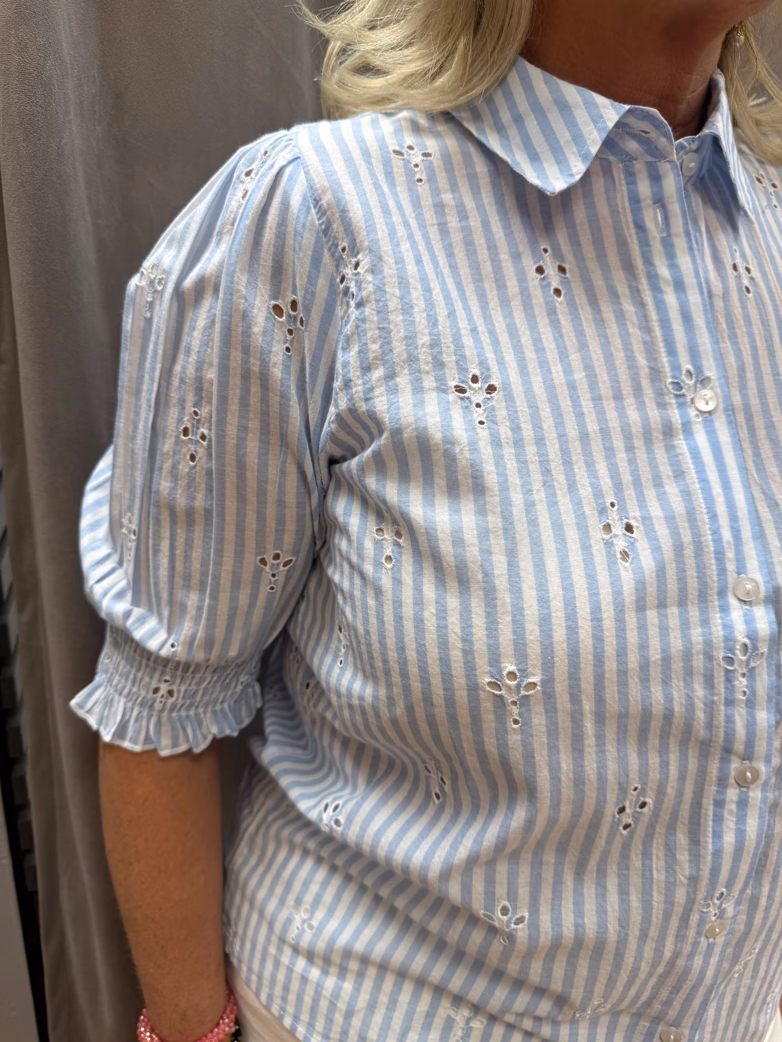 En feminin och somrig blus i klassiska blåvita ränder med vackra broderade detaljer. Den tidlösa skjortmodellen kombineras med mjuka puffärmar och dekorativa hålbroderier som ger plagget en romantisk och elegant känsla.