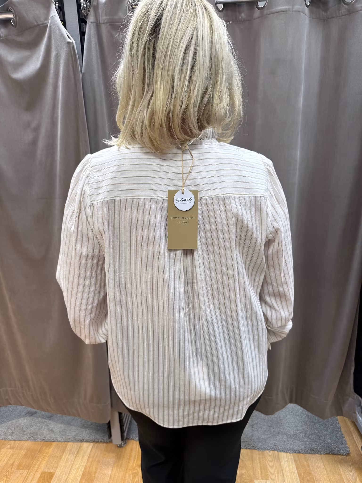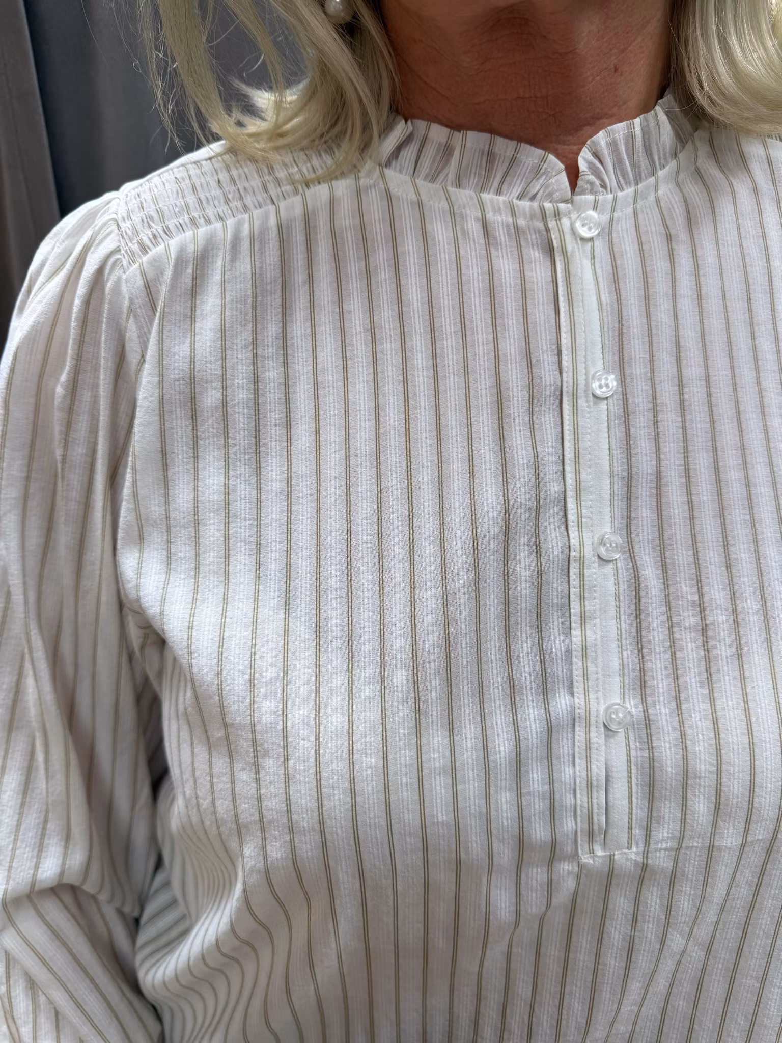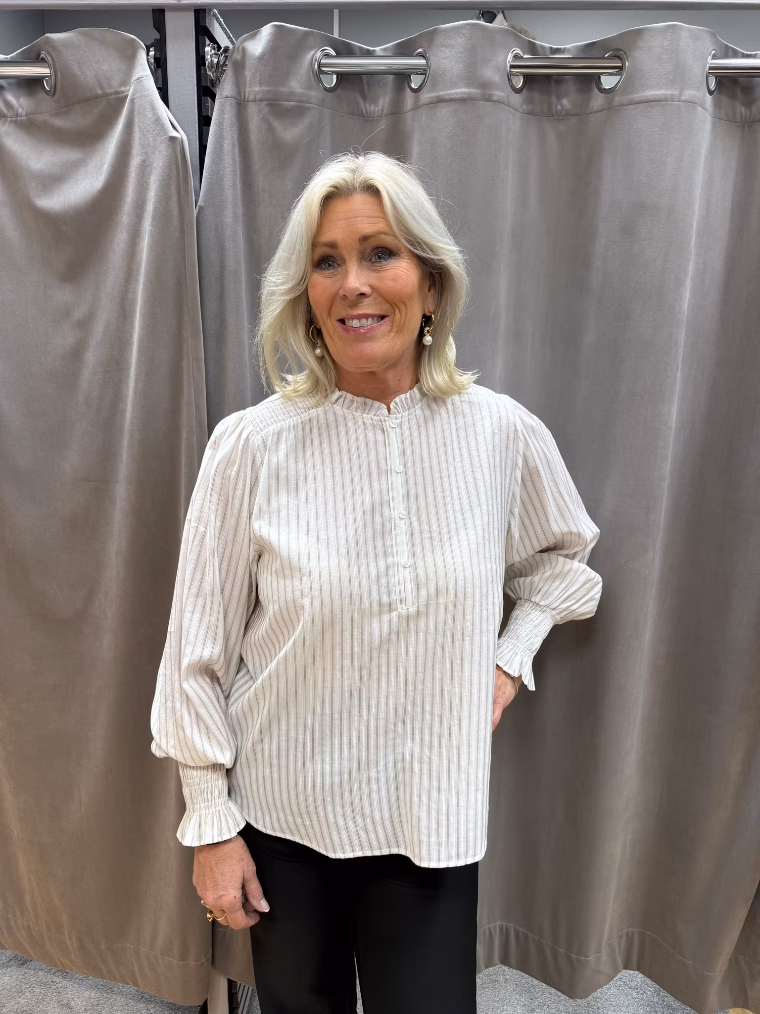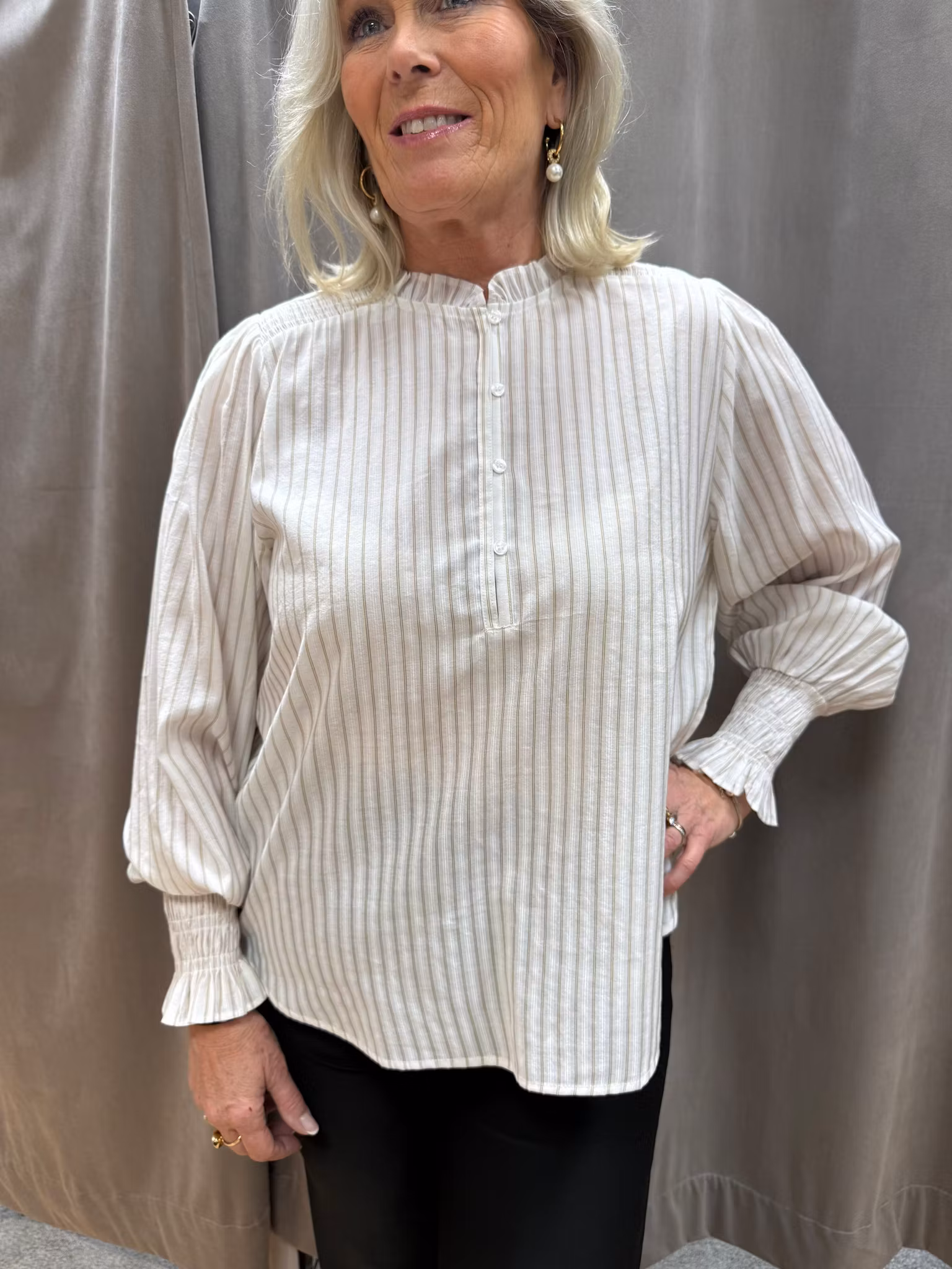 Elegant randig blus i mjukt och följsamt tyg med tunna beige ränder på vit botten. Blusen har en rak, ledig passform som ger en avslappnad men stilfull look. Den stående kragen och knappslån framtill ger ett klassiskt uttryck medan de långa ärmarna med smock och lätt puff ger en feminin touch.