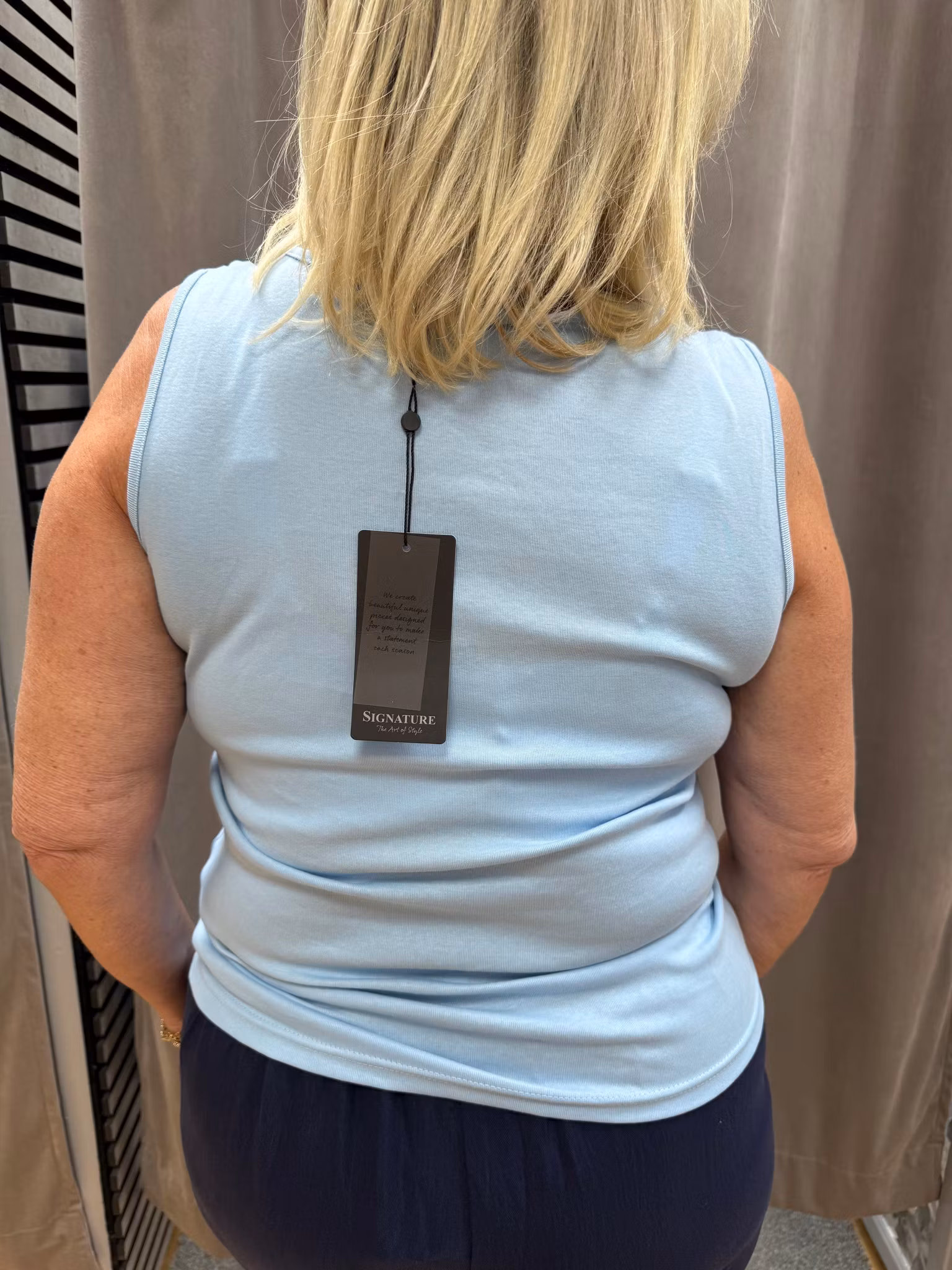 Elegant och bekvämt ljusblått linne i mjuk och stretchig kvalitet som sitter smickrande mot kroppen. Toppen har bred axel och en stilren fyrkantig halsringning, vilket ger ett feminint och klassiskt uttryck. Den ljusrosa färgen är mjuk och lätt att matcha – perfekt som basplagg i garderoben.