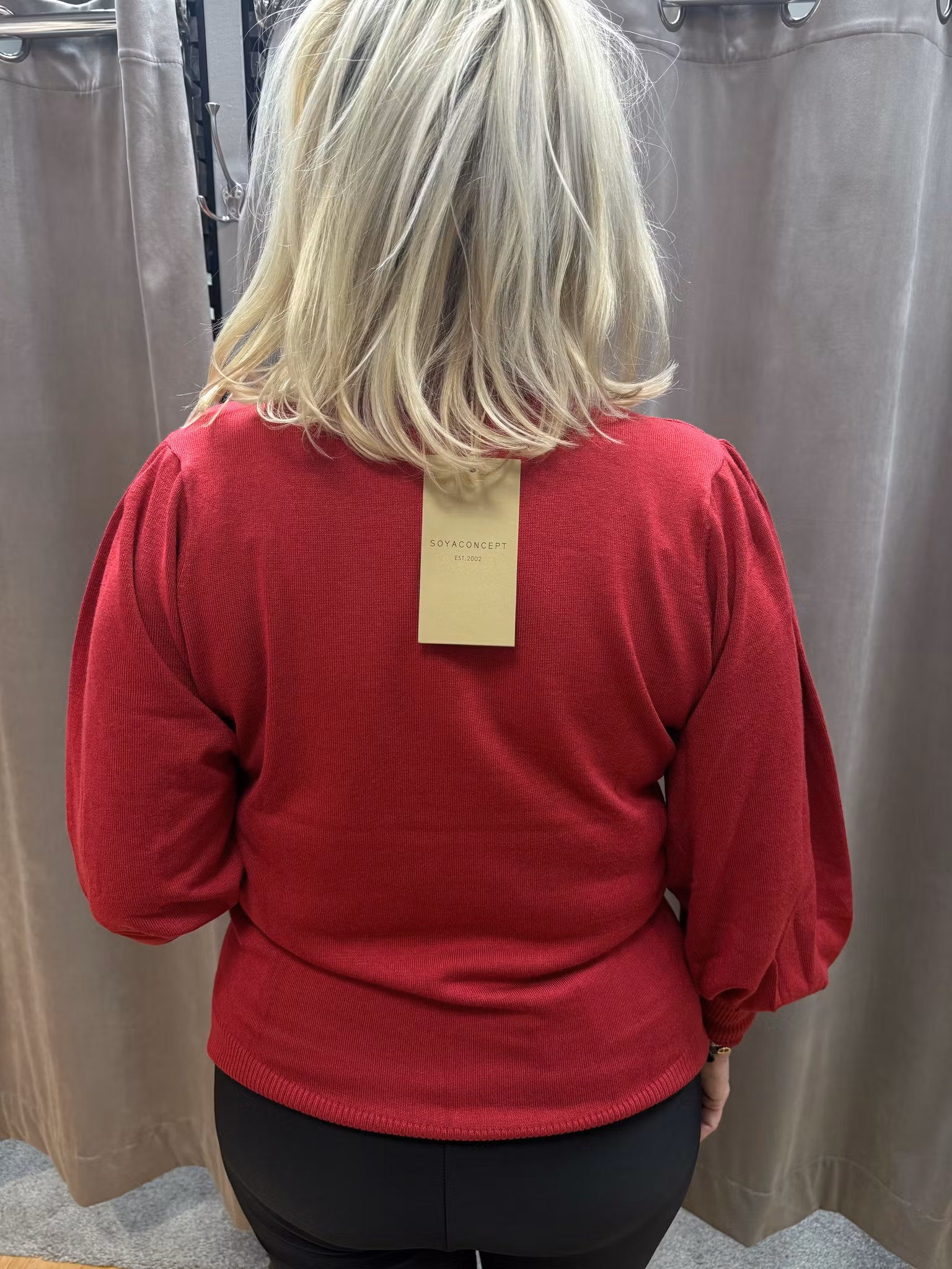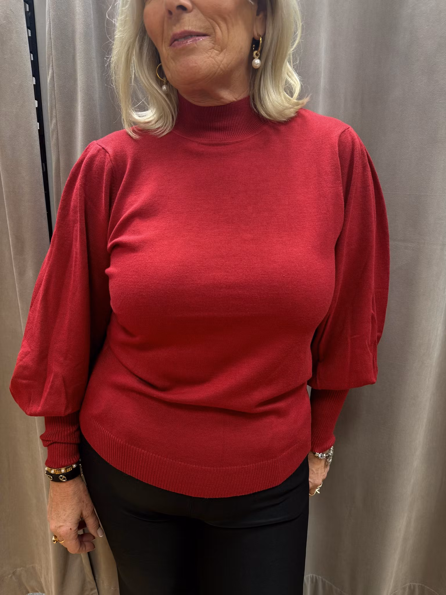 Elegant röd stickad tröja i mjukt och stretchigt material. Tröjan har en rak, feminin passform med hög hals och vackra puffärmar som ger en modern och stilfull siluett. Den ribbade kanten vid hals, ärmslut och nederkant ger en välsittande form och extra komfort.