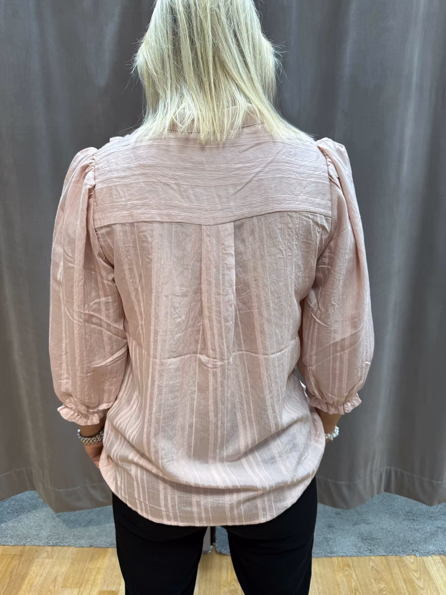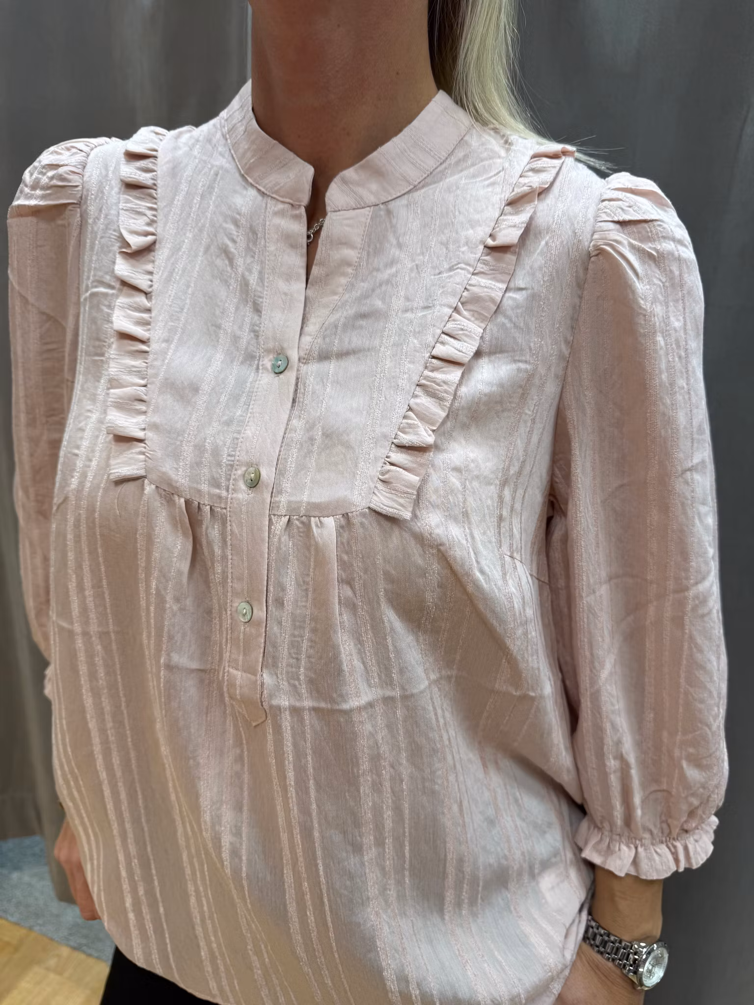 Romantisk blus i ljusrosa ton med dekorativa volanger framtill och längs ärmslut. Modellen har trekvartsärm, ståkrage med knappslå samt en lätt A-linjeform som ger en avslappnad men feminin silhuett. Perfekt att bära både till vardags och mer uppklädda tillfällen.