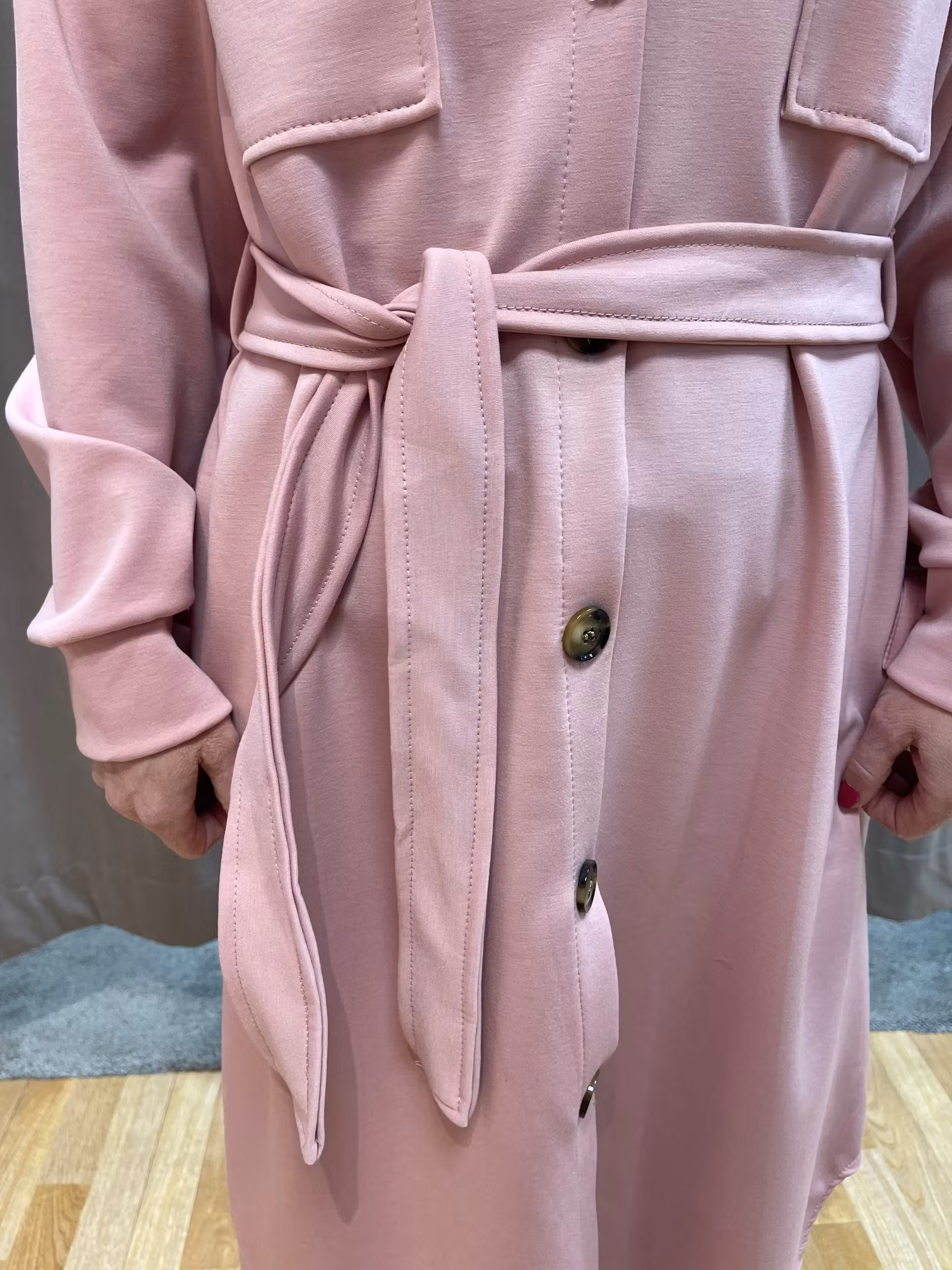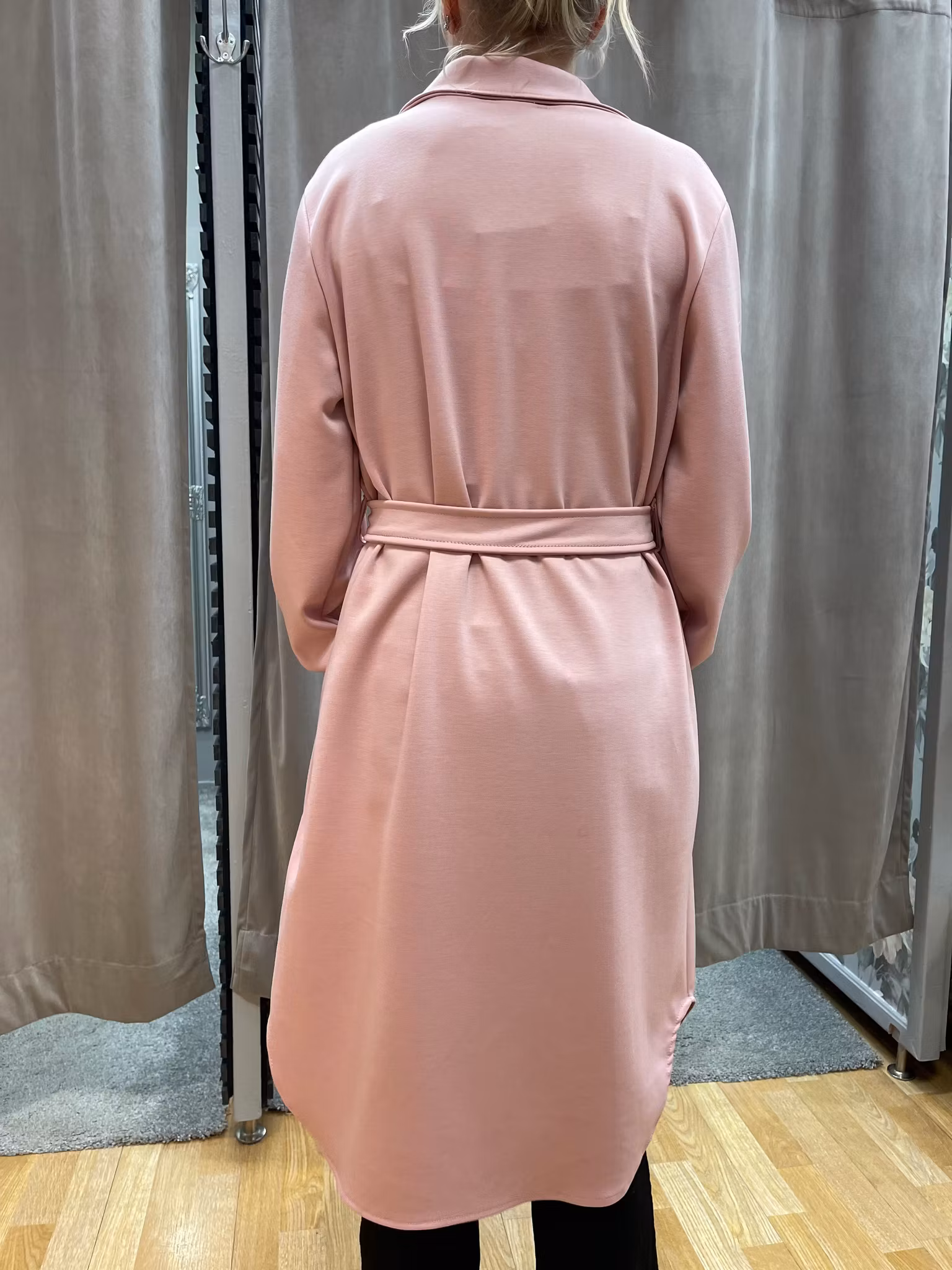 Mjuk kappa i följsamt material med en stilren och tidlös design. Modellen har klassisk krage, knäppning framtill och dekorativa bröstfickor som ger ett genomarbetat uttryck. Kappan är lätt figursydd och har ett avtagbart knytband i midjan som gör det enkelt att justera passformen. Lång ärm och generös längd ger ett elegant fall och gör plagget perfekt som ett bekvämt ytterlager för både vardag och arbete. En mångsidig kappa som kombinerar komfort med ett välklätt intryck.