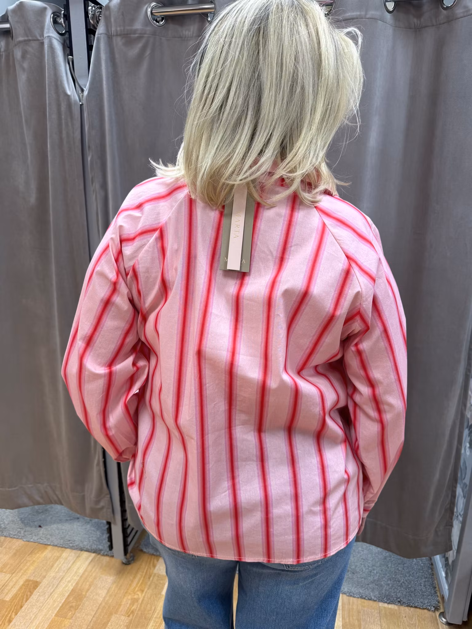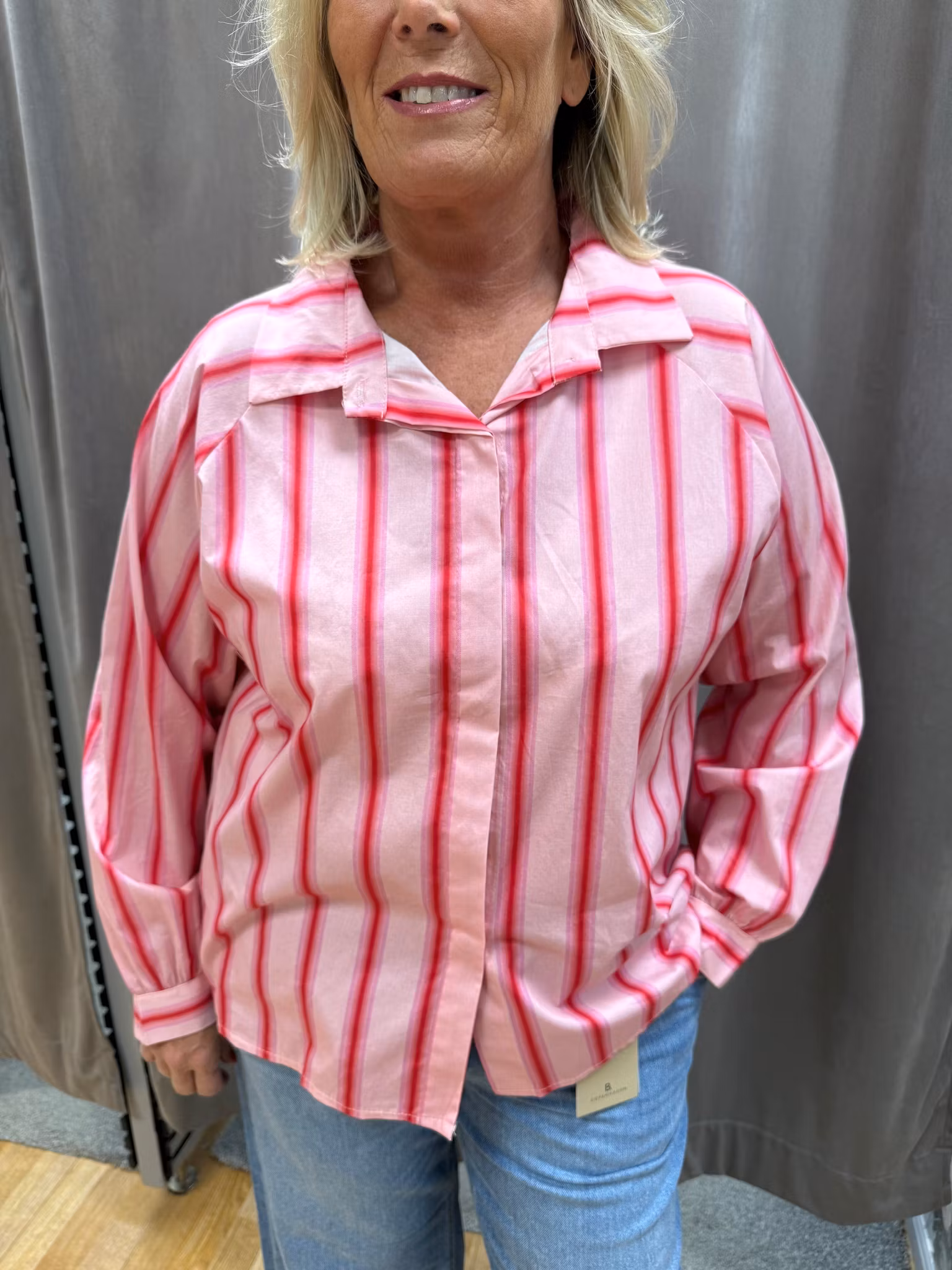 Fräsch och feminin rosa randig skjorta med ett mjukt och stilrent uttryck. Skjortan har klassisk krage, knappstängning framtill och lång ärm, vilket ger en tidlös design som är enkel att styla. De vertikala ränderna i rosa och cerise skapar ett smickrande intryck och ger plagget en modern touch.