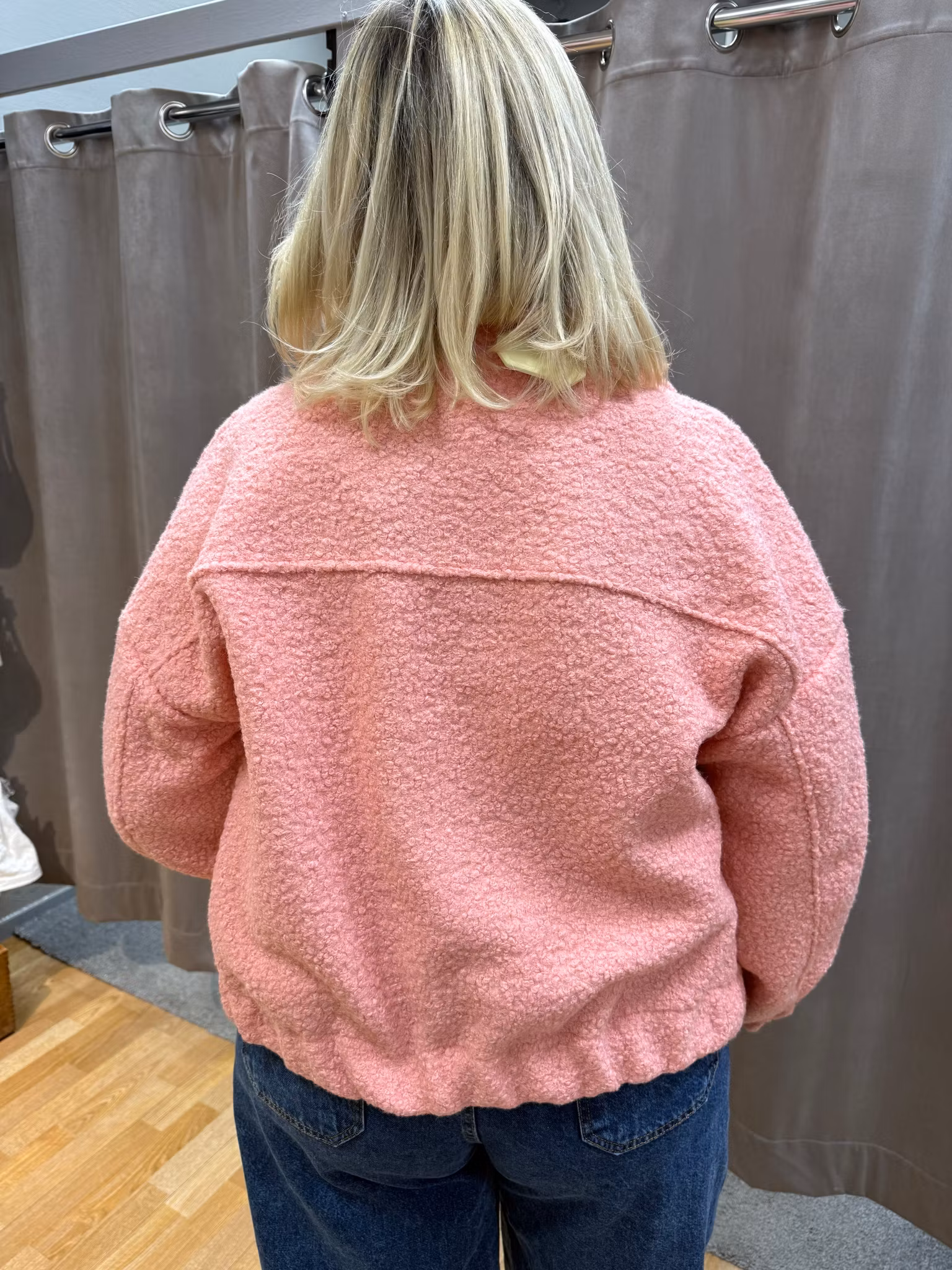 En trendig och lättburen rosa jacka i One size, tillverkad i mjuk bouclé med behaglig struktur. Modellen har klassisk krage, knäppning framtill och bröstfickor med knapp, vilket ger ett modernt men tidlöst uttryck. Den avslappnade passformen gör jackan perfekt både som övergångsjacka och som ett extra lager inomhus.