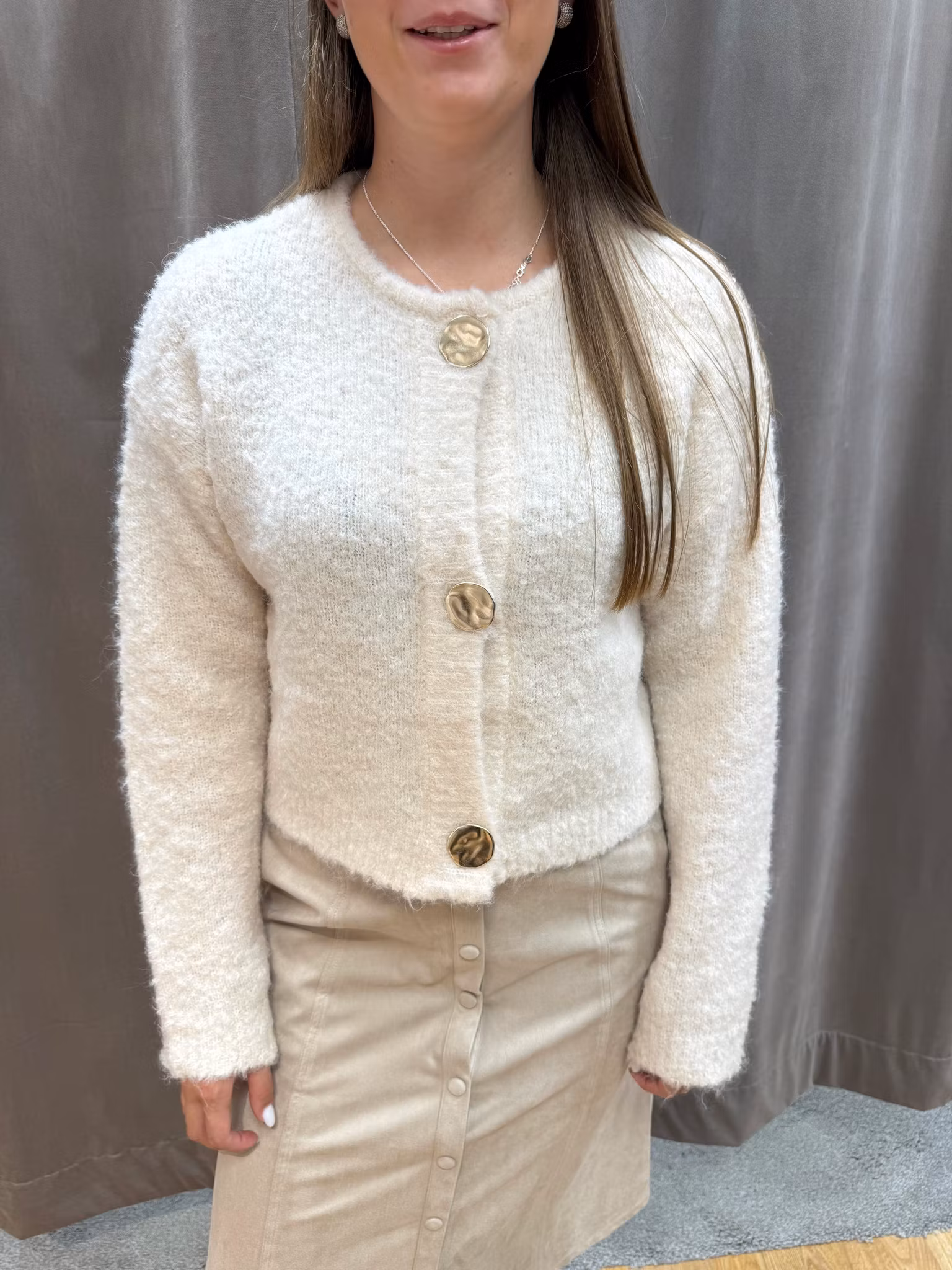 Mysig och stilren kofta i mjuk stickad kvalitet. Den offwhite koftan har rund halsringning, raka ärmar och dekorativa stora knappar framtill som ger en trendig touch. Perfekt som vardagskofta, kontorsplagg eller att bära lager på lager under kyligare dagar.